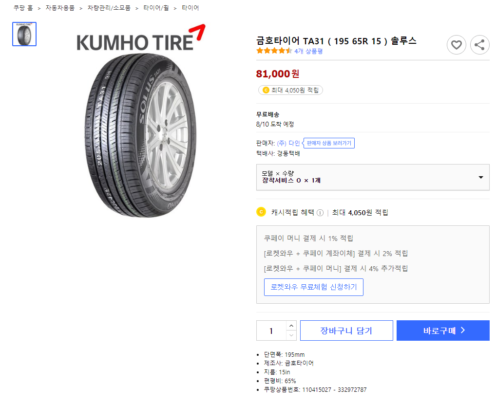 제 타이어 사이즈는 195 65R 15로 온라인으로 처음 해봐서 일단 제일 저렴한 금호타이어 솔루스로 했습니다.