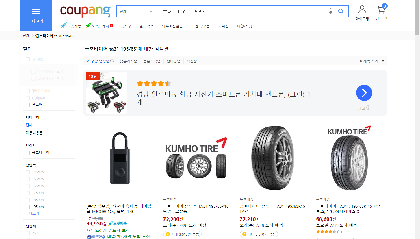 쿠팡을 이용하시는 분은 위 링크를 걸어두었으므로 들어가 보시면 됩니다.(업체는 ABC타이어, 리뷰가 그나마 몇 개 있어서 이용해 보기로 함)