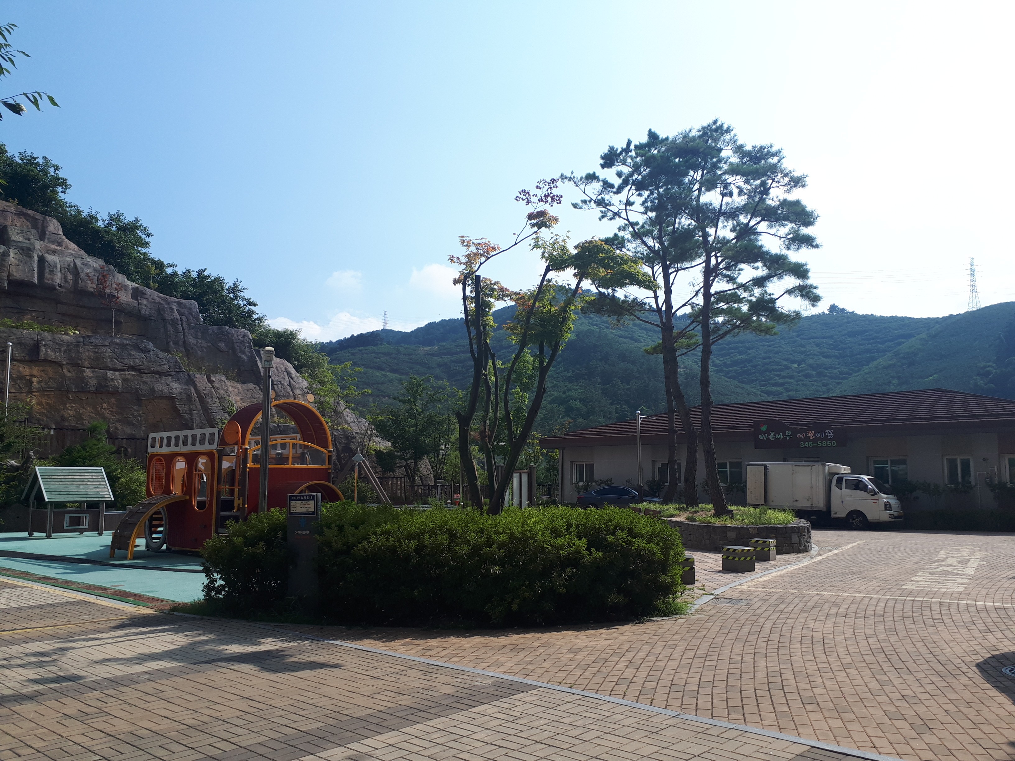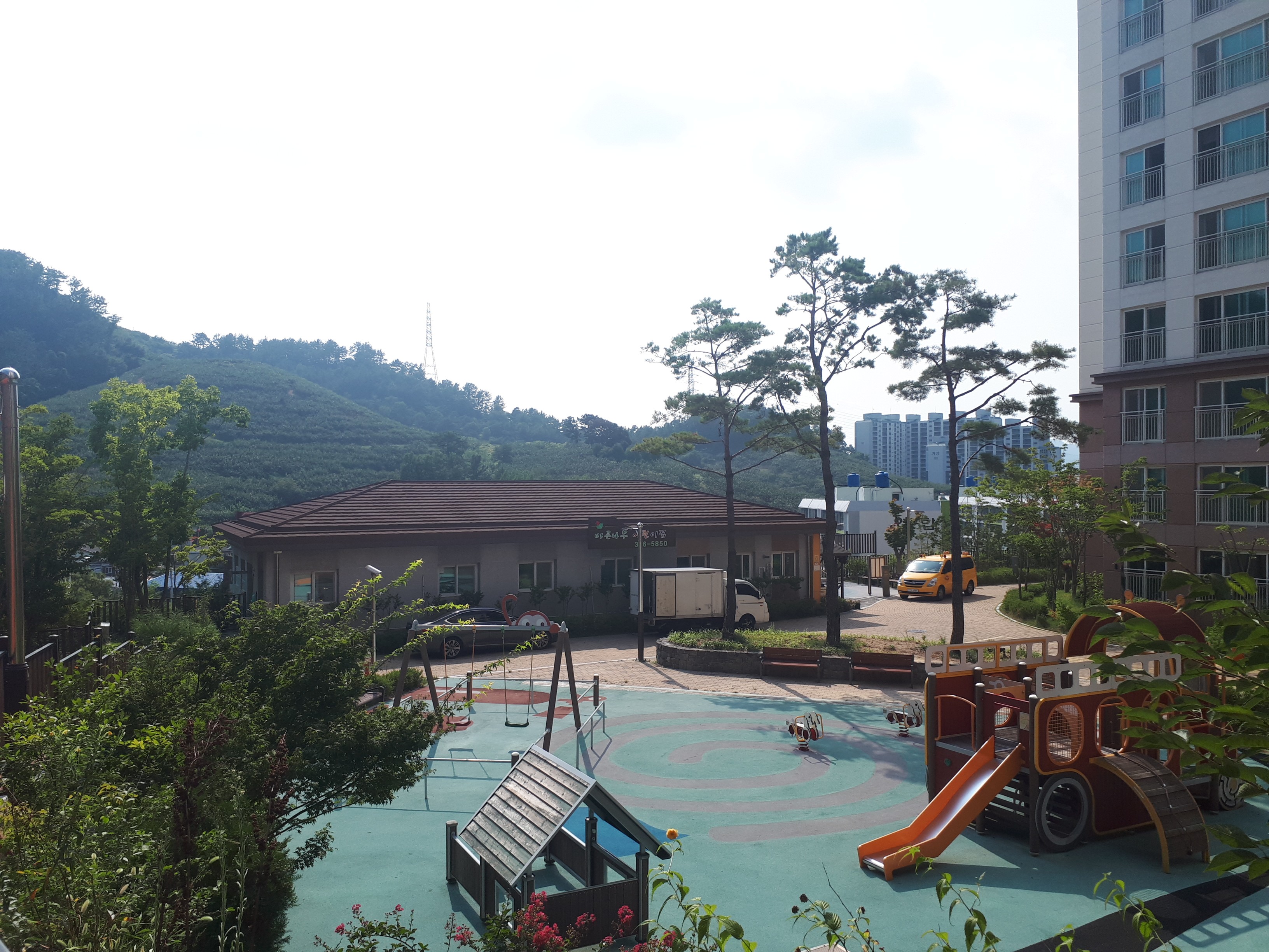 어린이집을 위에서 내려다보니 마치 보성녹차밭 앞에 있는 작은 마을 같았고 바람이 상쾌했습니다.