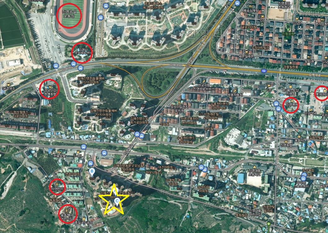 멀리 보면 김해시 문화체육센터가 있고, 차로 10분 내에 진영 병원과 전자상가 등 다양한 인프라를 누릴 수 있습니다.