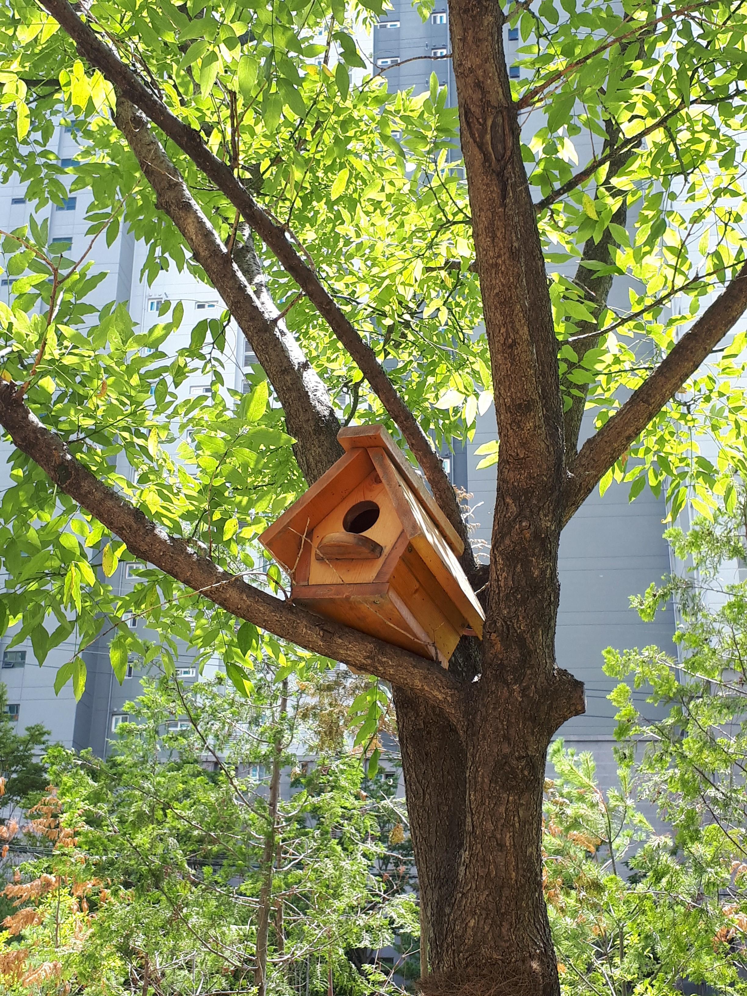 지나가다 새집도 발견했어요. 일부러 설치한 건지는 모르겠지만 입주민들의 동의하에 설치했다면 주민 간에 소통이 잘 이루어지고 있다는 것 같네요. 저도 설치해봐서 알지만 왔던 새는 이곳에 또 와서 둥지를 틀기 때문에 아이들 학습에도 좋을 것 같네요.