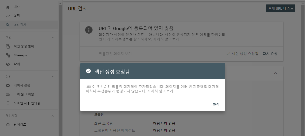 그렇게 하면 요청 제출이 되고 색인 생성 요청 완료 알림이 나오게 됩니다. 저도 이번에 처음 알게 되어 요청 후에 어떤 문제점이 추가로 발생하는지 알아본 뒤 추가로 업데이트하도록 하겠습니다.