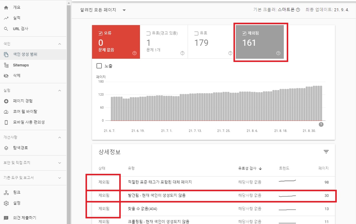 그러고 보니 글을 쓰는데만 열중했지 이를테면 '홍보'에 신경을 쓰지 않았던 것 같습니다. 그 결과 '제외됨-발견됨-현재 색인이 생성되지 않음'에 있는 글 수가 30개나 된 것을 확인했습니다.