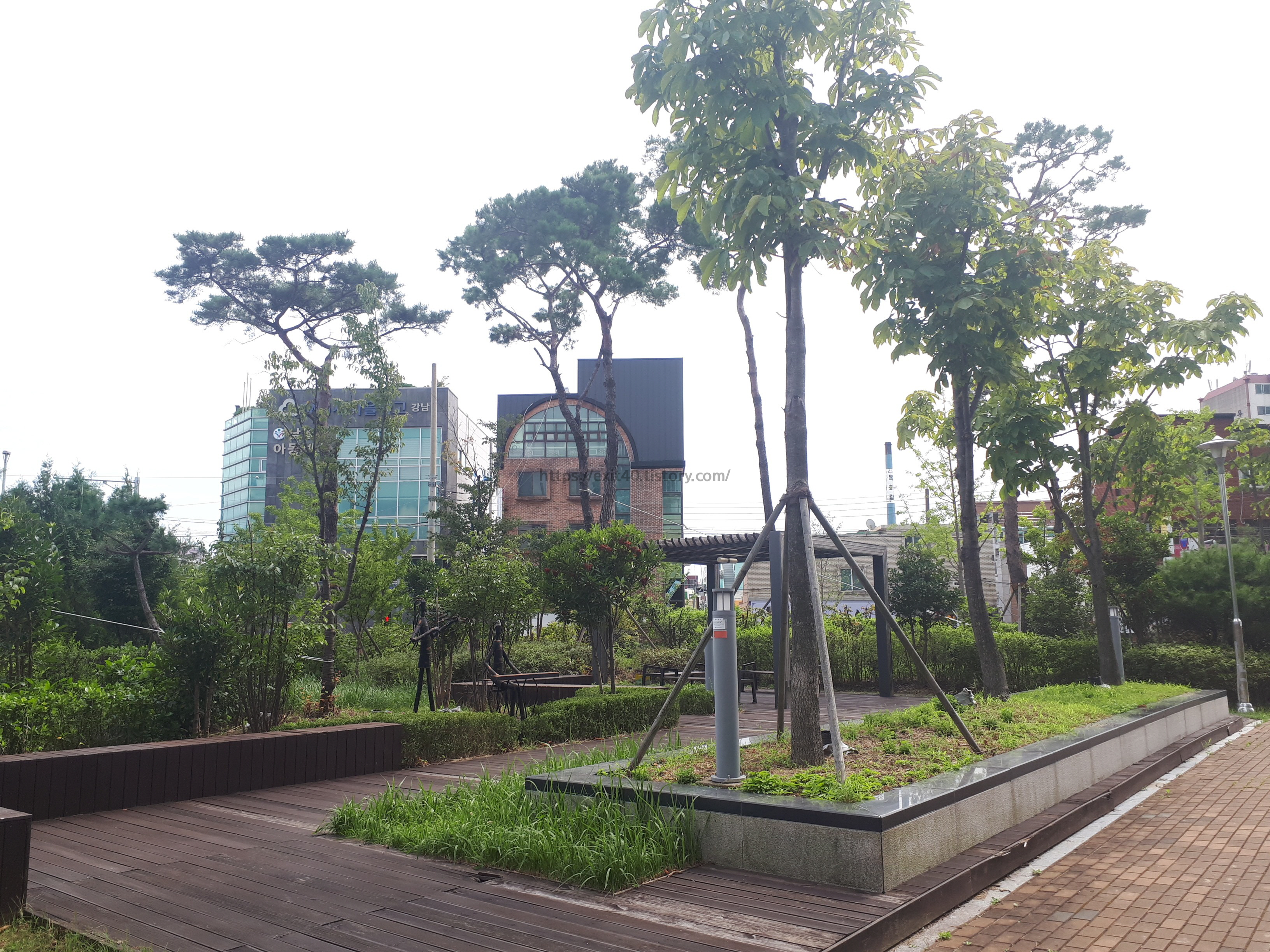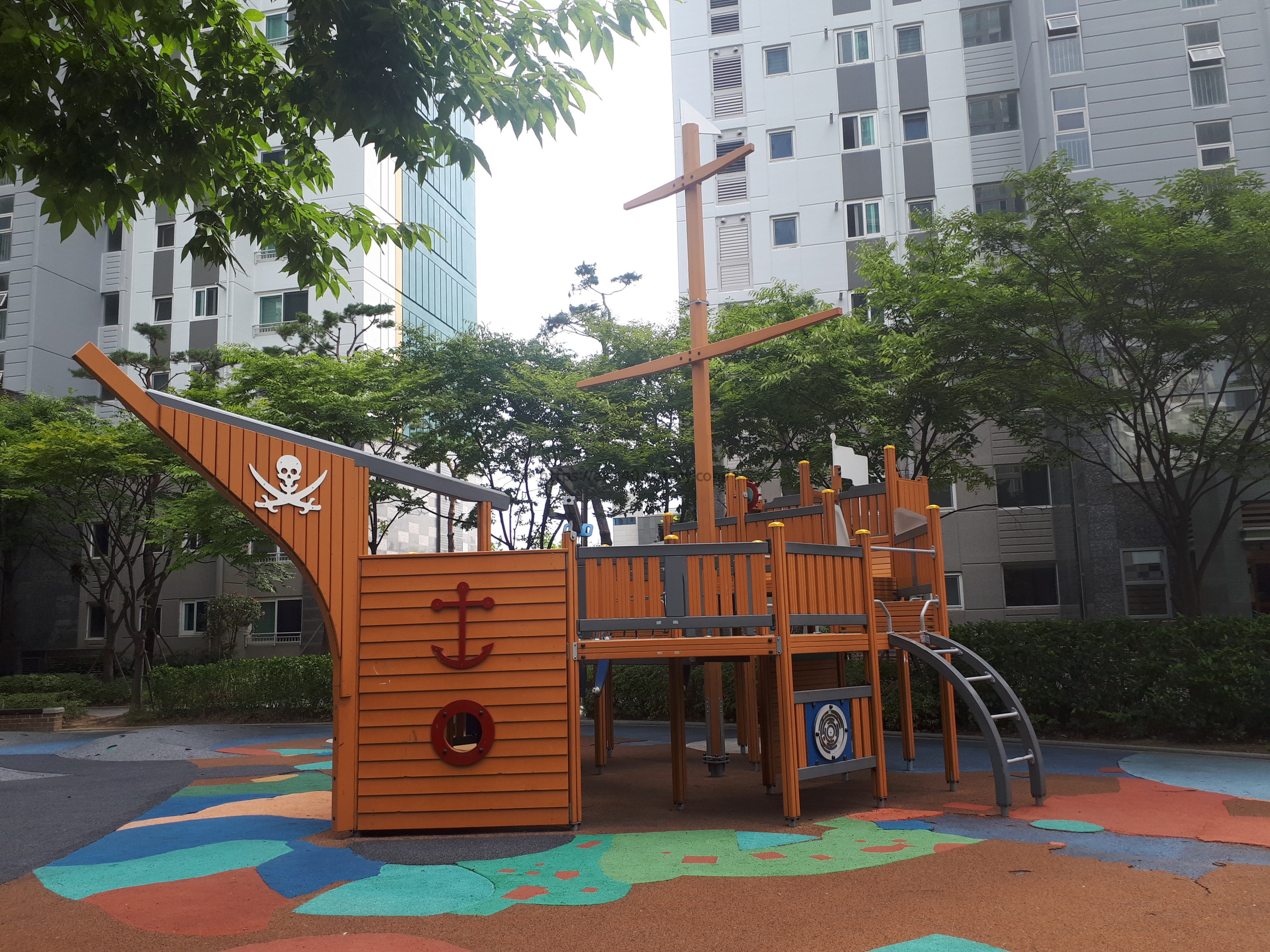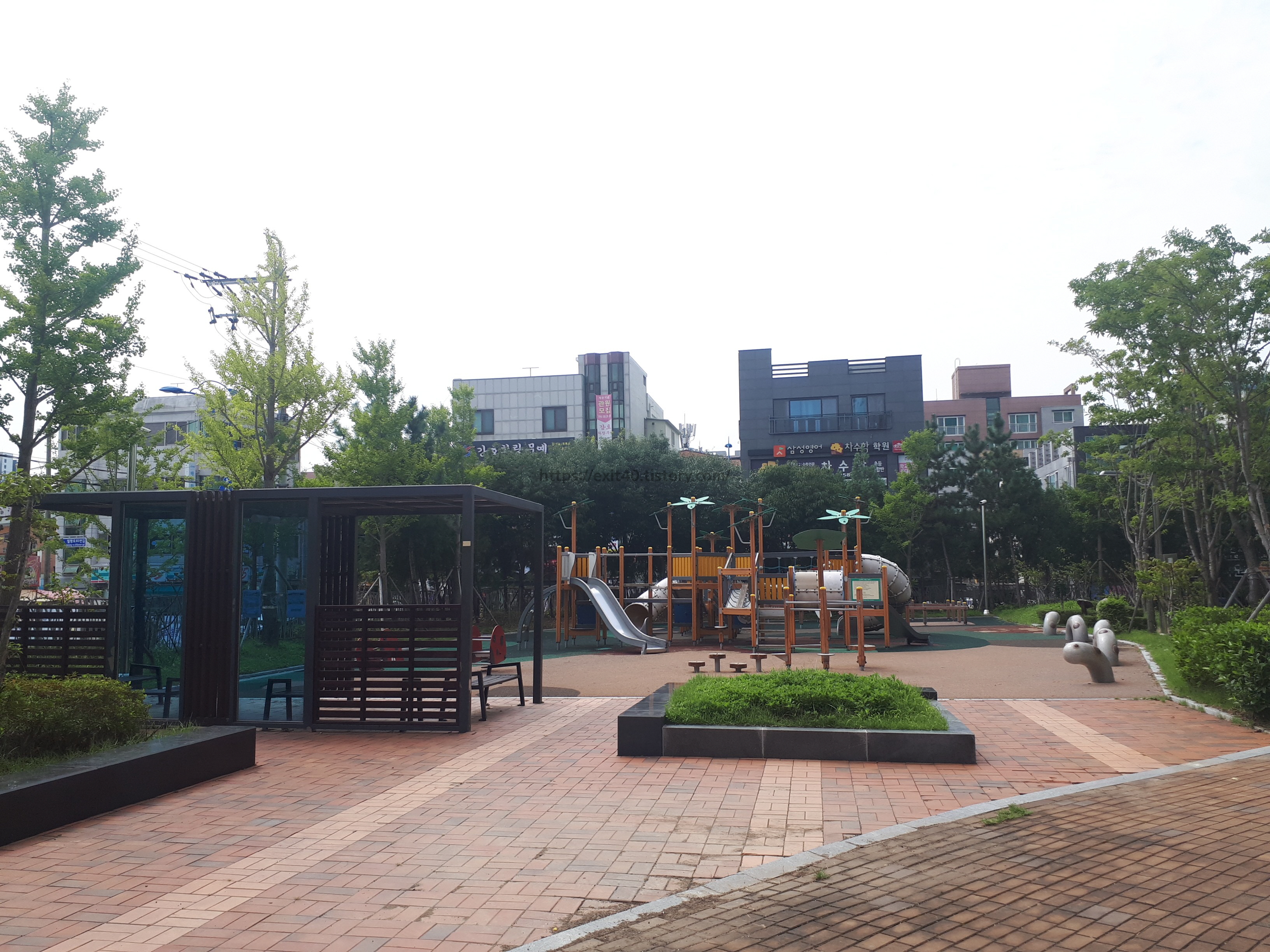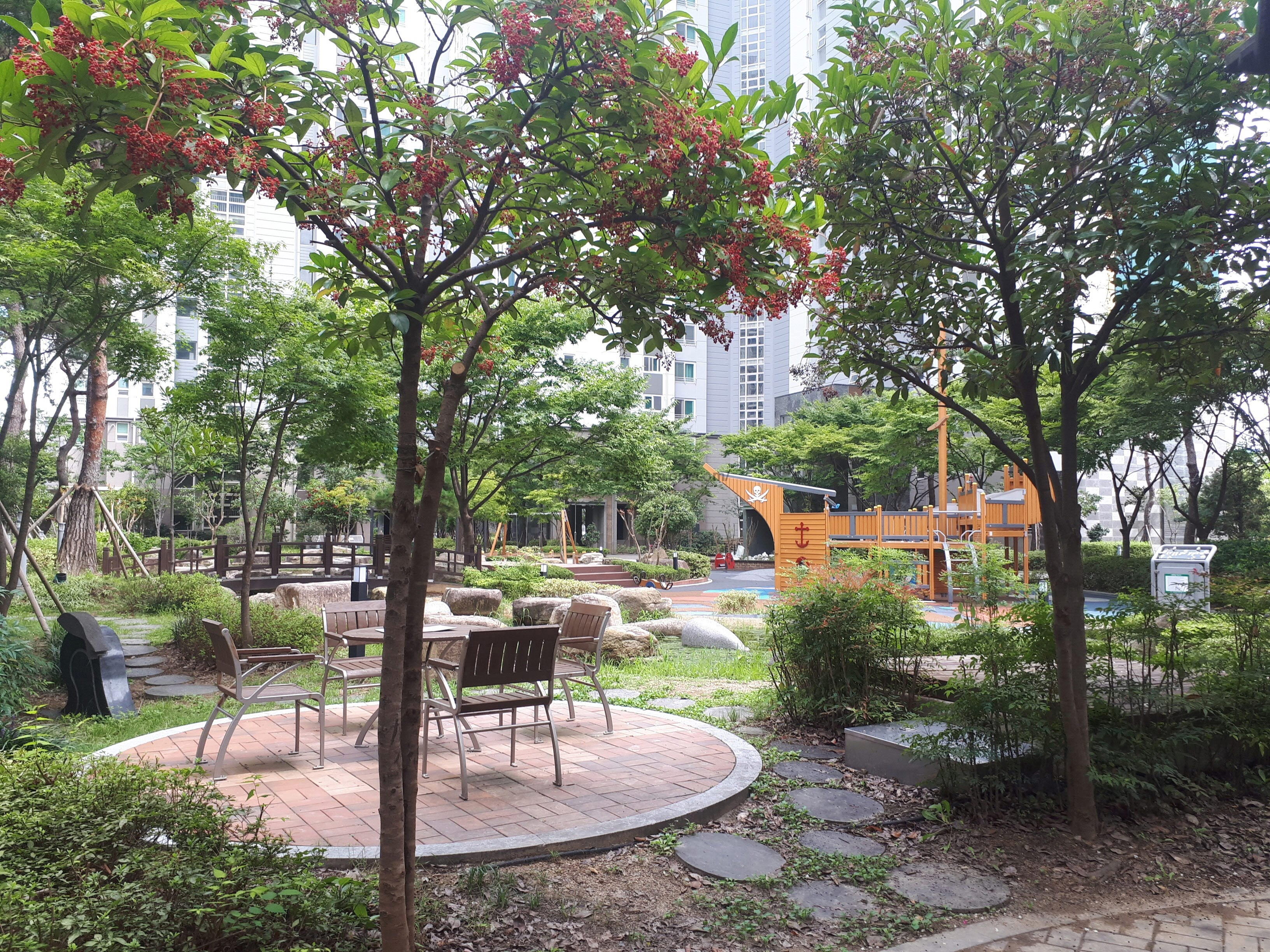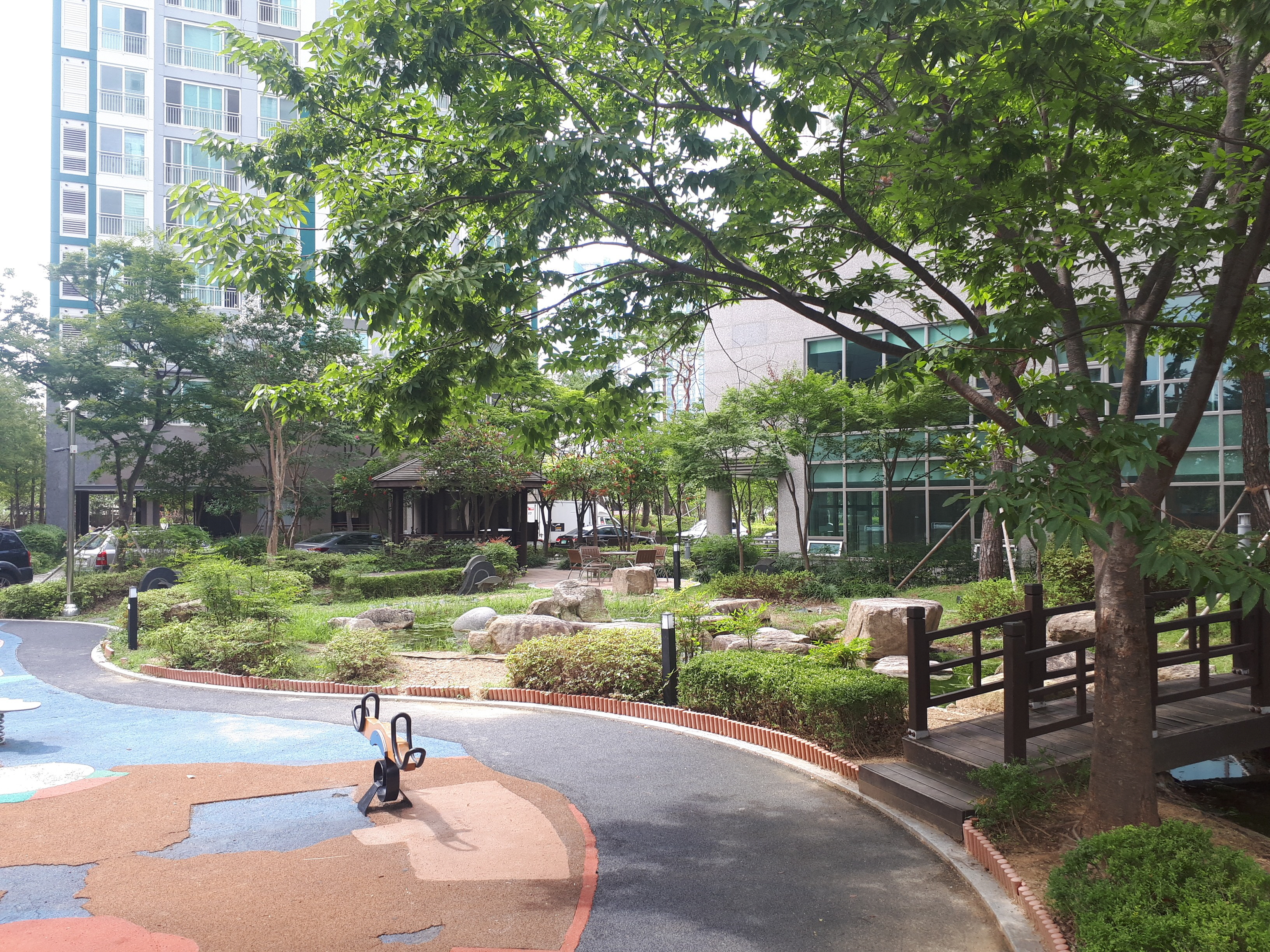 심플하면서 현대적인 놀이터와 쉼터가 조화로웠습니다.