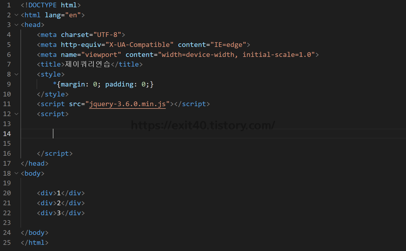그리고 <script src>으로 제이쿼리를 연결시켜준 후, body안쪽에 <div></div>로 만든 상자 3개를 작성합니다.