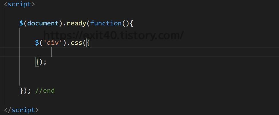 'div'박스를 선택하기 위해 $(document).ready(function(){ }); 안쪽에 $('div').css({ });를 작성해줍니다.