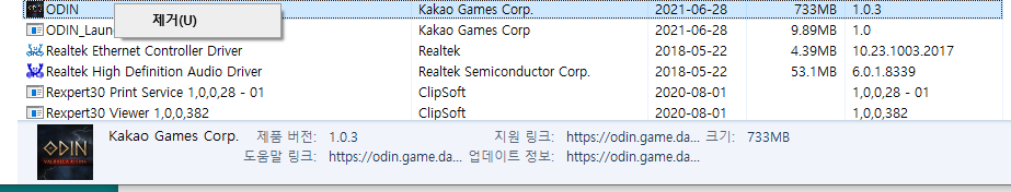오딘을 제거하고 다시 설치해보기로 했습니다. 결과는 일곱 번째 실패..