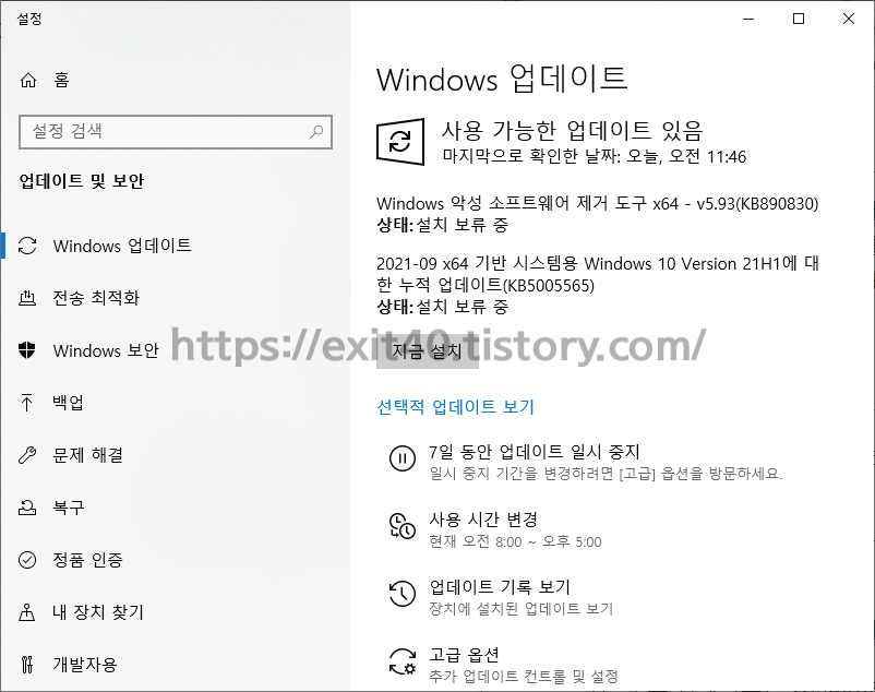 누군가가 윈도우 업데이트를 하면 된다는 소리가 있어서 해보기로 했습니다. 마침 '제어판-설정-Windows 업데이트'를 클릭해보니 'Windows 악성 소프트웨어 제거 도구 x64 - v5.93(KB890830)' 설치 보류 중이라고 나왔습니다.