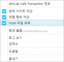 다른 글들을 보니 백신 프로그램과 충돌로 인해서 나타난다고 합니다. 그래서 AhnLab Safe Transaction 정보를 모두 끄고 켜보기로 했습니다.
