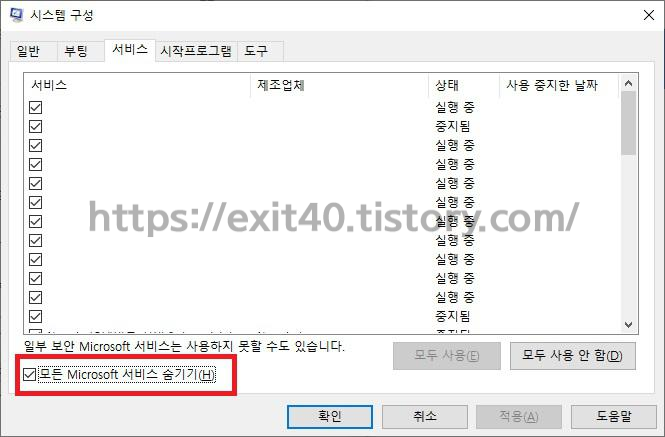 이를 위해서는 '실행-msconfig'를 실행시켜줍니다. 서비스 탭에서 모든 Microsoft 서비스 숨기기에 체크 후 모두 사용 안 함을 클릭해주고 시작 프로그램 탭에서도 모든 프로그램 사용 안 함을 클릭(필수 실행 프로그램 제외)을 해줍니다.