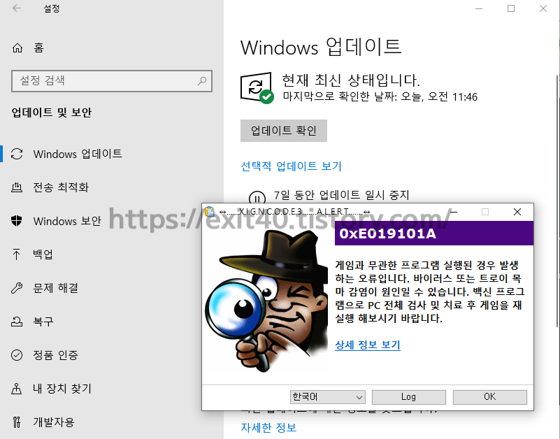 오류에서 바이러스 또는 트로이목마 감염이 원인일 수도 있다고 하여 혹시 이 업데이트를 하지 않았나 의심되어 업데이트를 하고 재부팅을 해봤습니다.