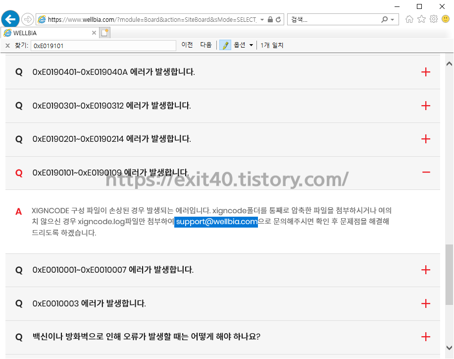 웰비아에 접속해 보니 XIGNCODE.LOG파일을 첨부하여 support@wellbia.com으로 보내달라고 돼있네요.