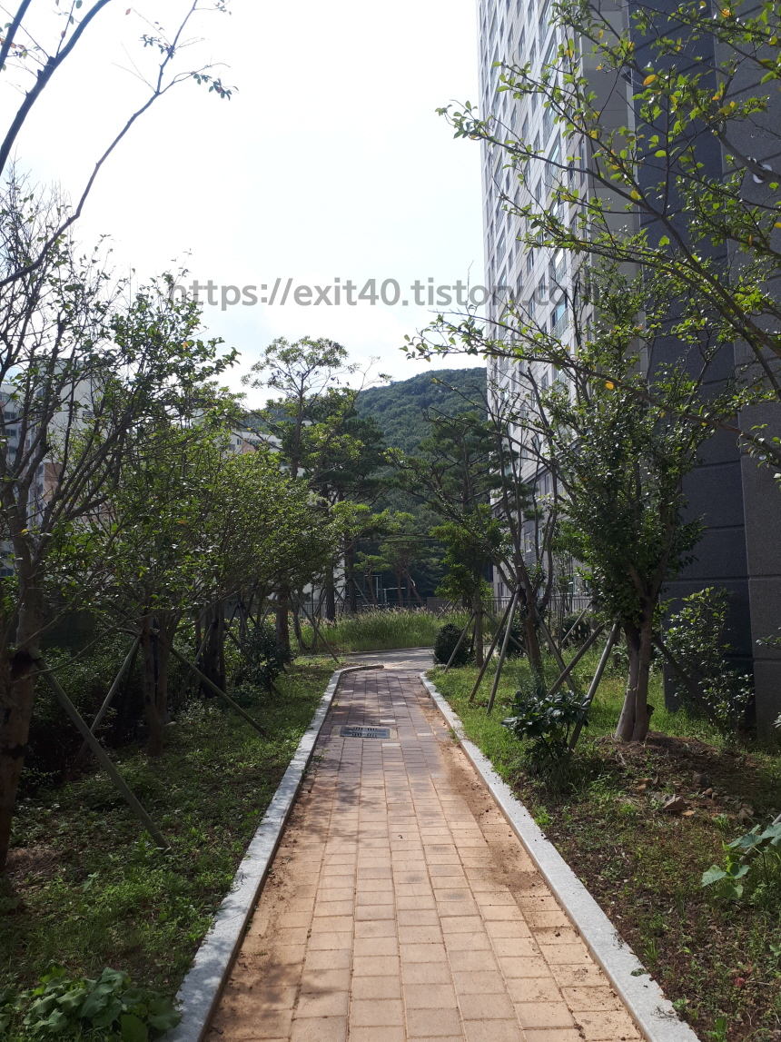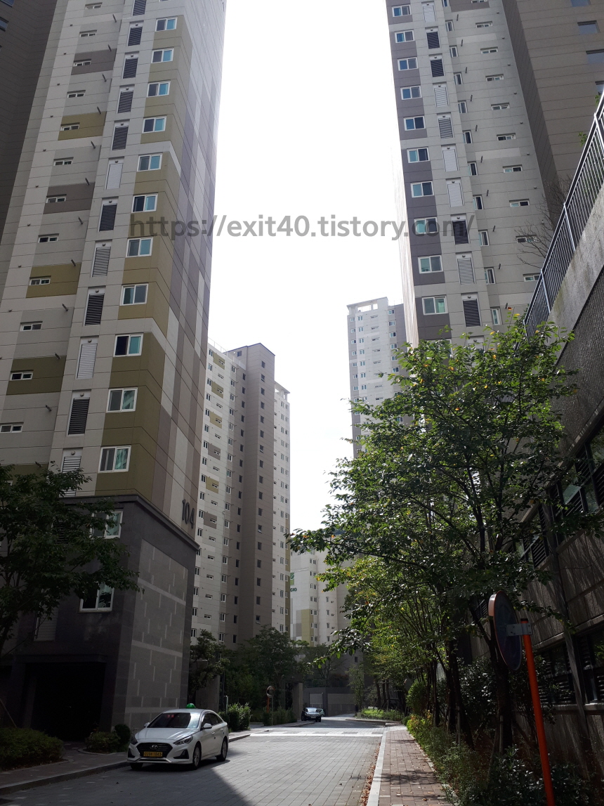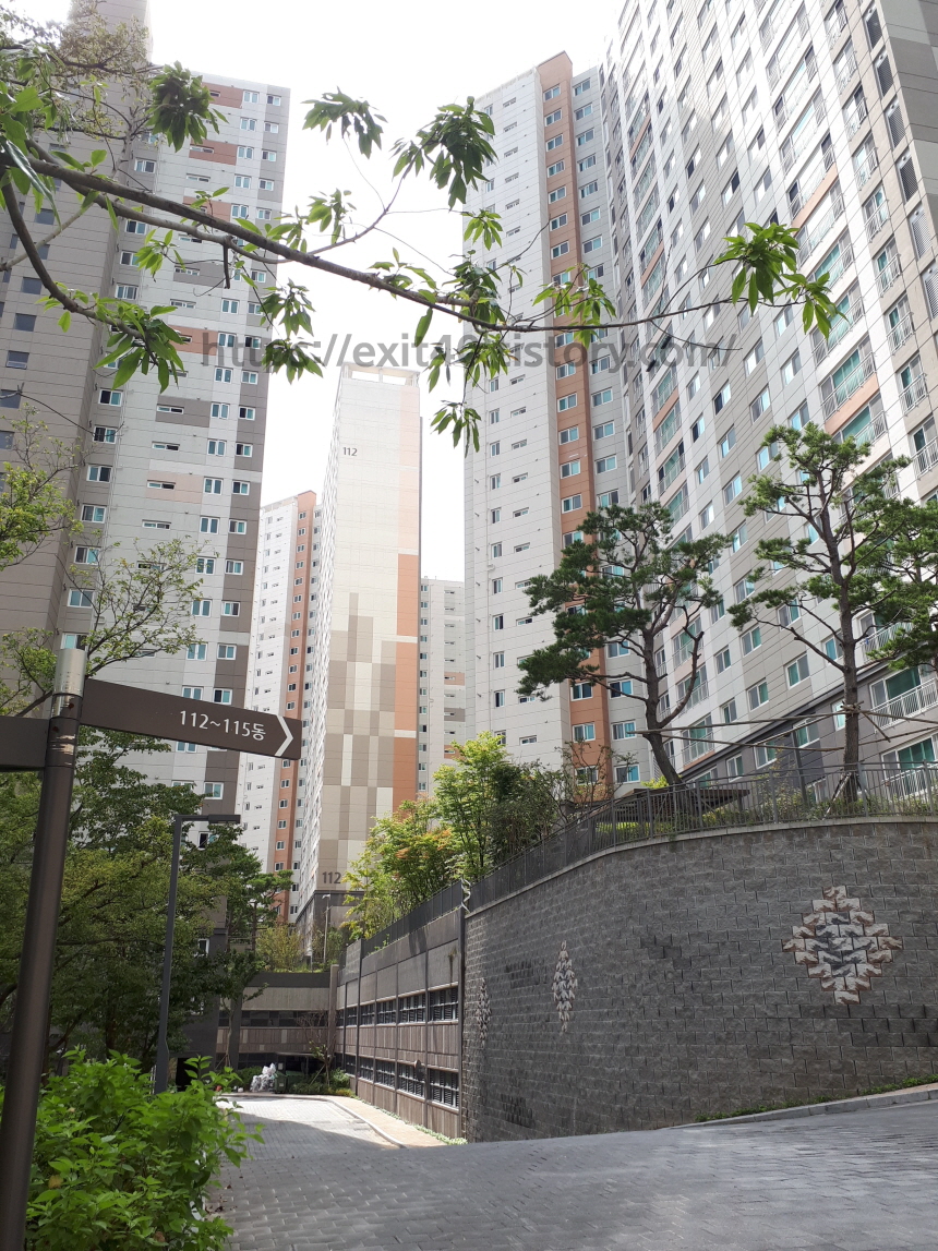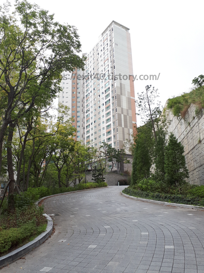 회색 벽돌담이 묵직하고 단단해 보이는 효과를 주어 아파트가 견고해 보였습니다.