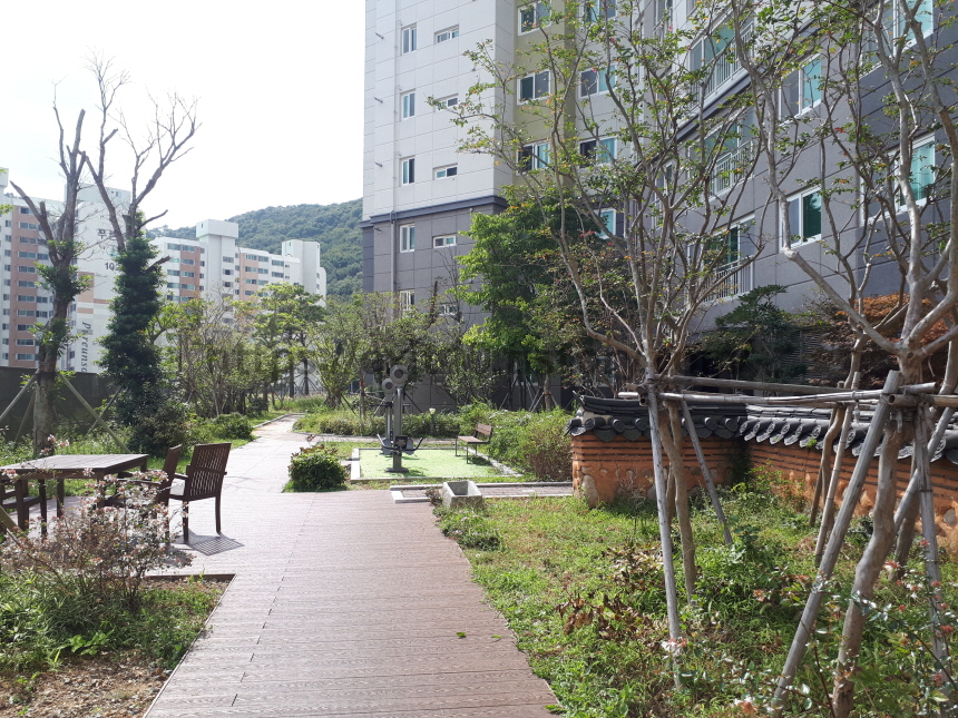 한옥 담벼락과 놀이터의 조화가 잘 맞네요.