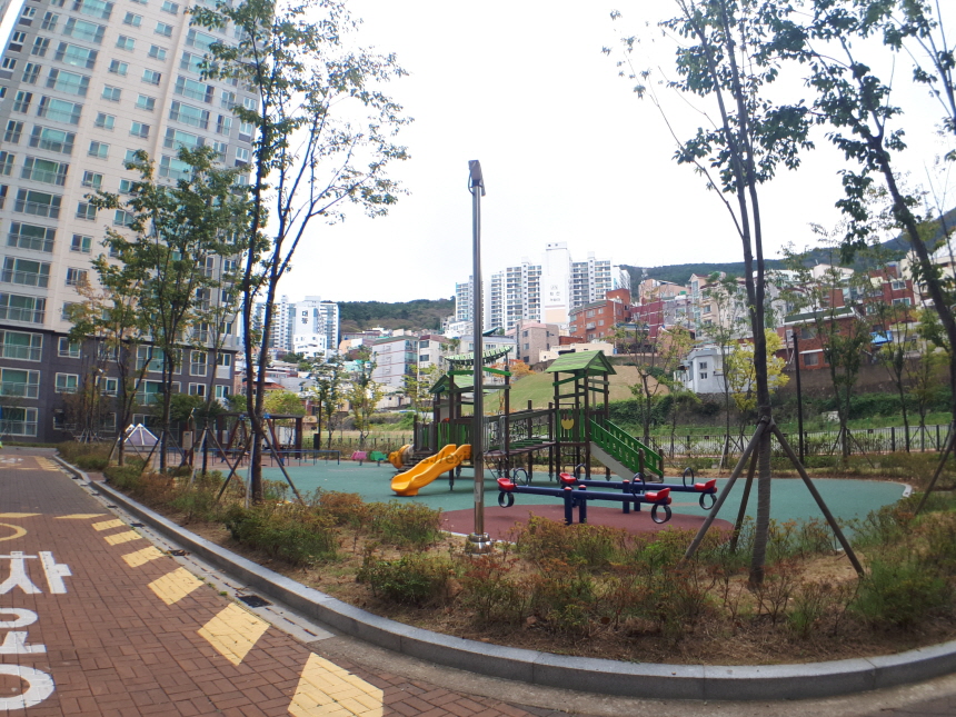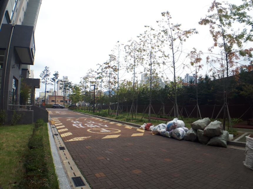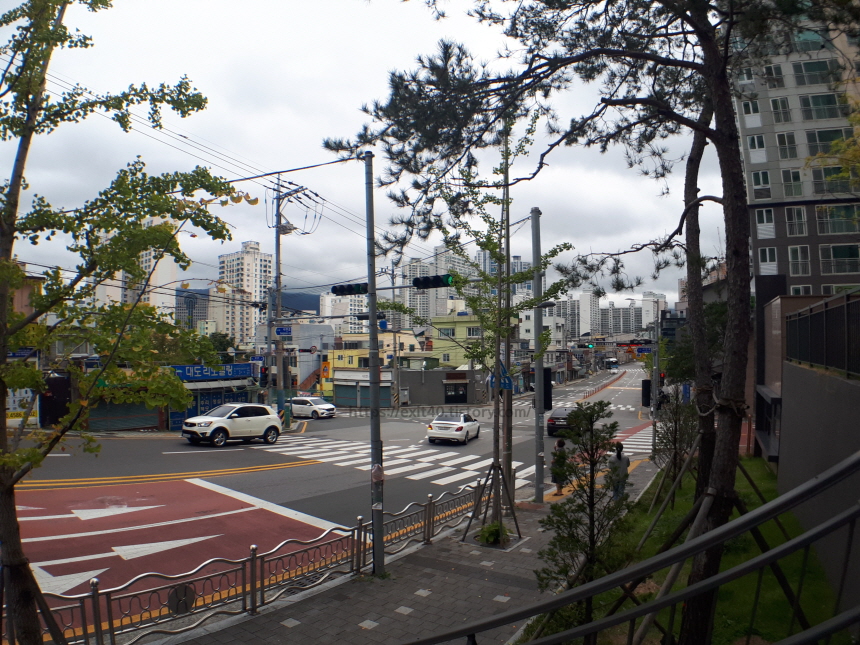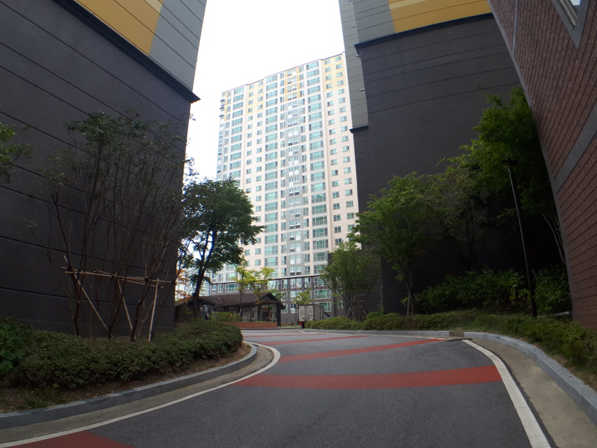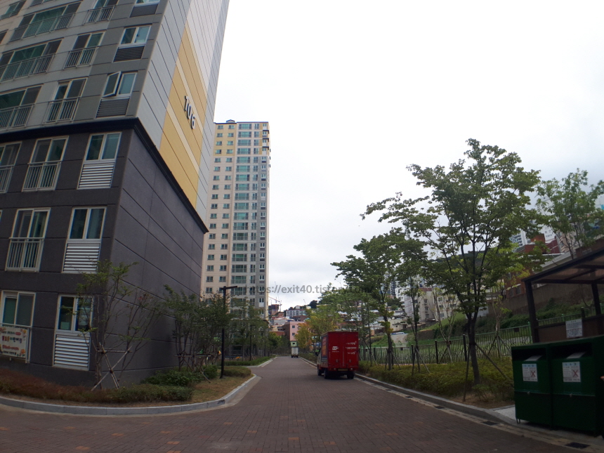 아파트 단지 내로 들어서니 깔끔한 분위기가 반겨 주었습니다. 산책하시는 분들도 많았는데요, 뒤쪽 산에는 마을이 있고 앞에는 전포동 카페거리가 있어 두 경치를 보면서 산책하기 좋은 곳이었습니다.