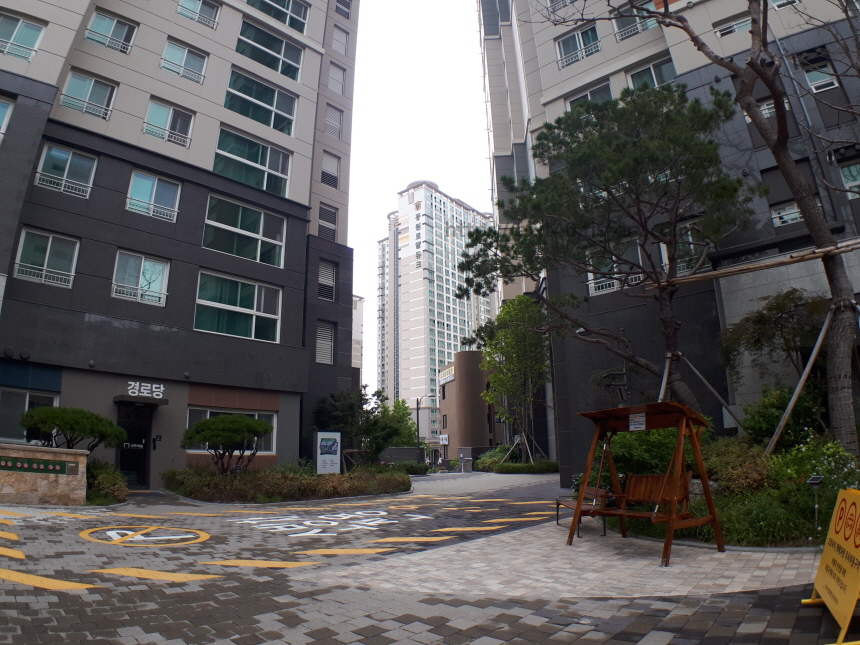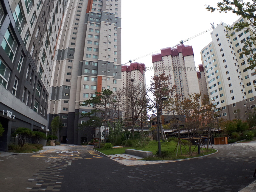 단지 내부는 흰색과 회색을 조화롭게 섞어 길이 꾸며져 있었고 조경은 넘치지 않고 적당하게 있었습니다.