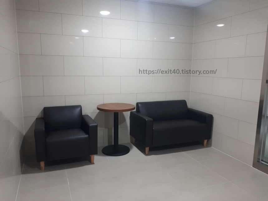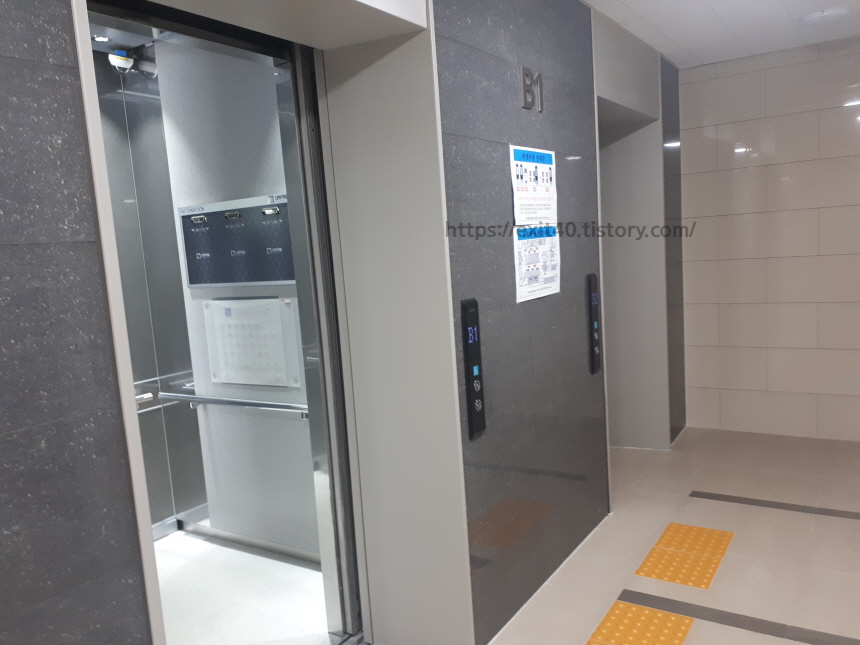 공동현관문 앞은 방문객들이 쉴 수 있게 소파가 마련되어있고 엘리베이터 안까지 전부 은색 톤으로 디자인되어있어 깔끔해 보입니다.