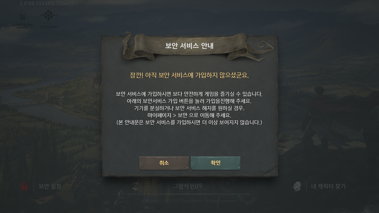 우선 서버 선택 화면으로 이동 하셔서 좌측 하단에 '보안 설정'을 클릭해줍니다.
