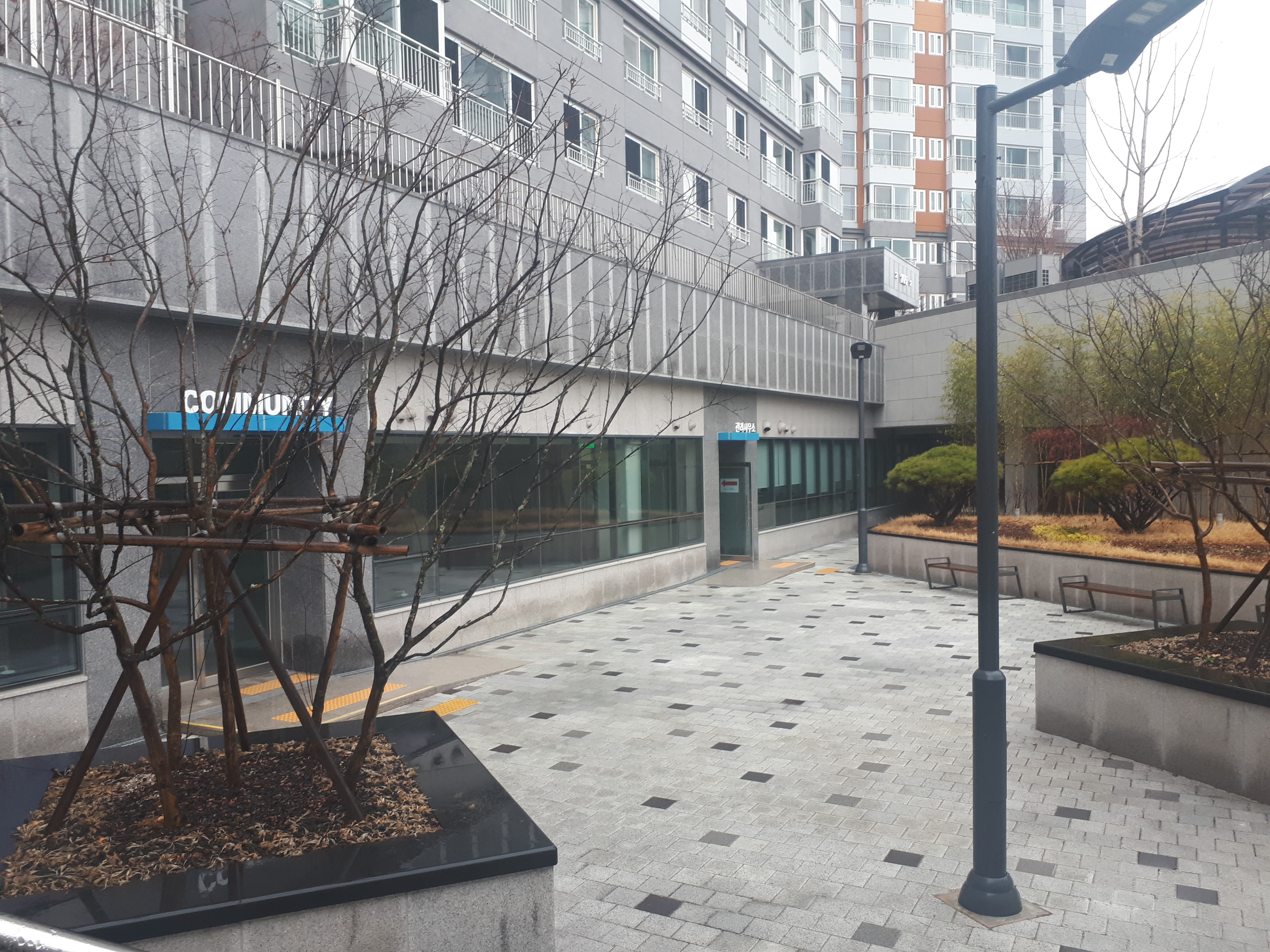 중아에는 아래로 뚫린 홀이 있고 커뮤니티센터에는 헬스장 그 옆에는 관리사무소가 있었어요. 의자와 앉을 수 있는 곳을 곳곳에 배치한 것으로 보아 소통에 중심을 두고 있다는 것을 볼 수 있었어요.