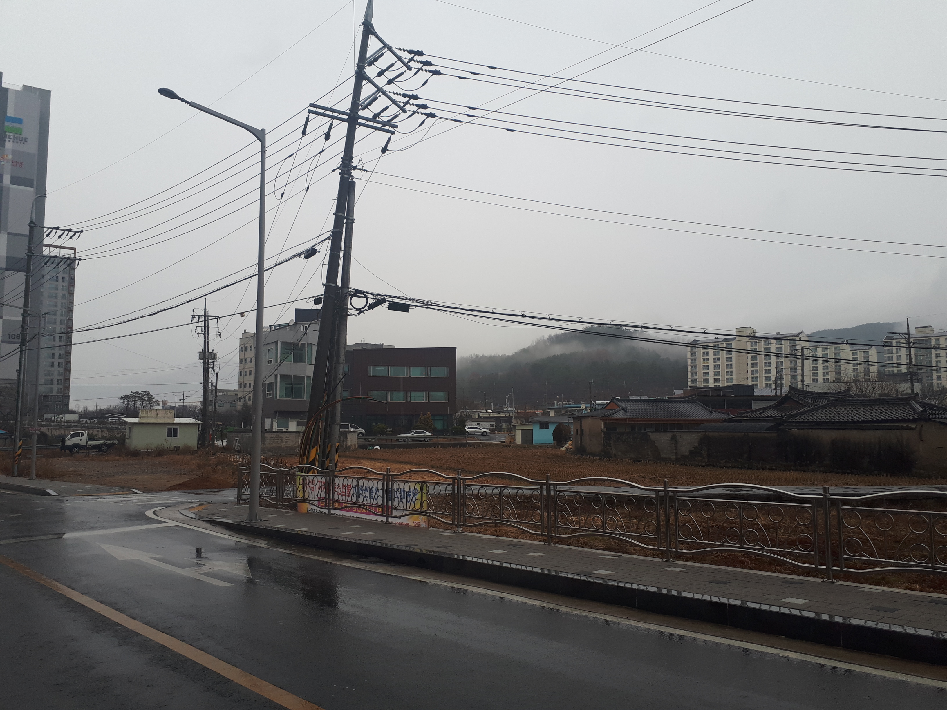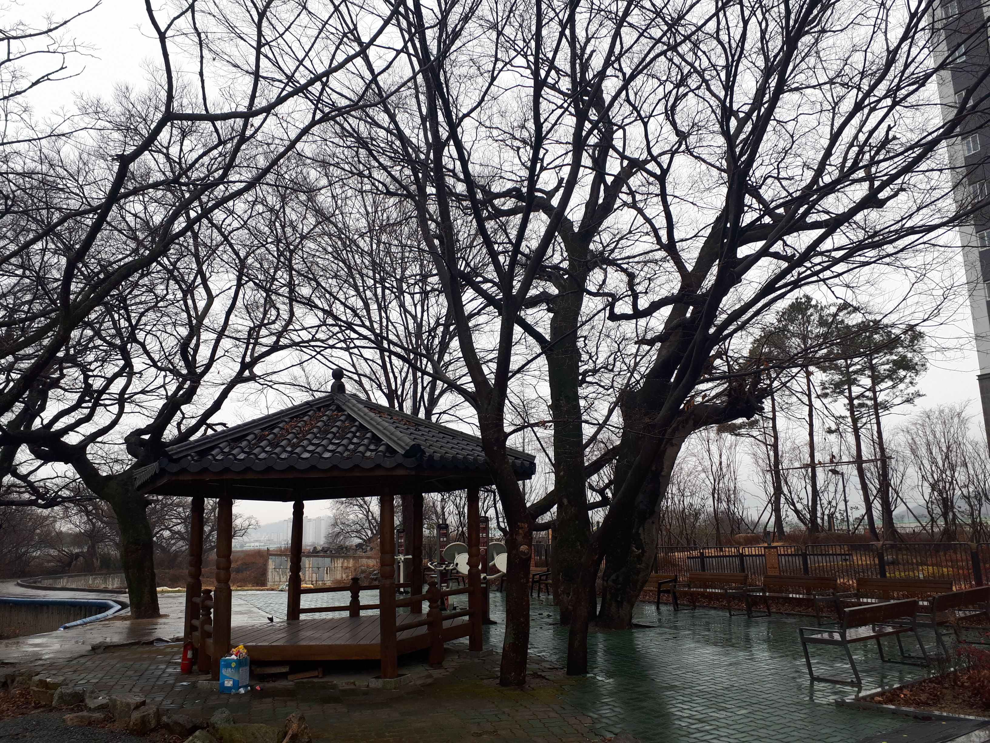 정문 앞에는 정자와 간단히 운동기구가 있어요. 주변에 논밭이 펼쳐져있는 데다가 비 까지 오니 정말 운치 있었습니다.
