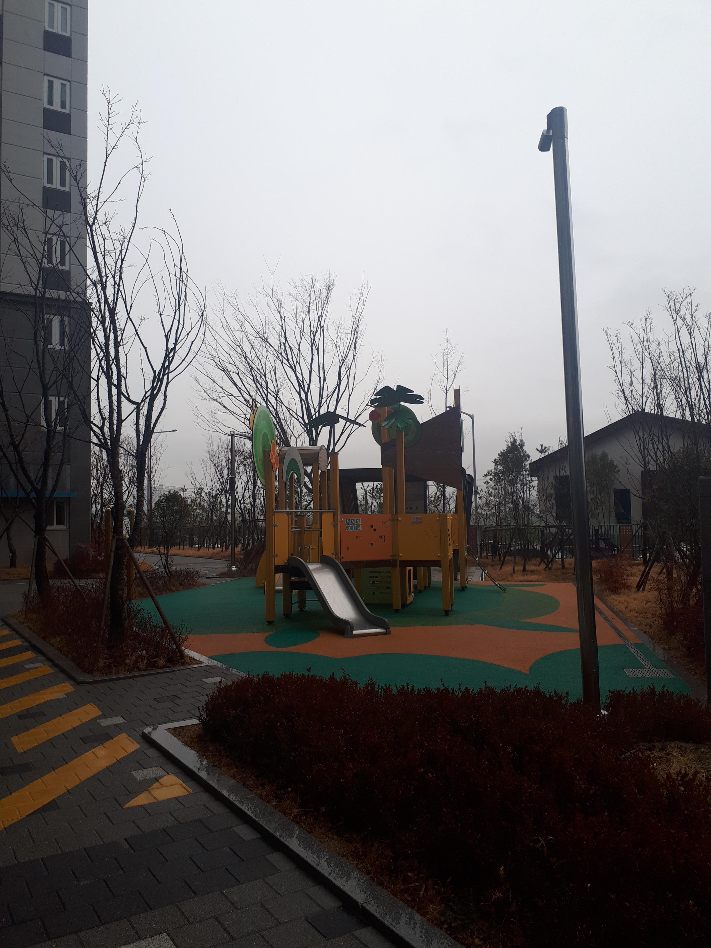 심플하면서 현대적인 분위기를 살린 놀이터와 주변 쉼터. 산책을 하다 여기 앉아 이웃과 담소를 나누면 행복할 것 같네요.