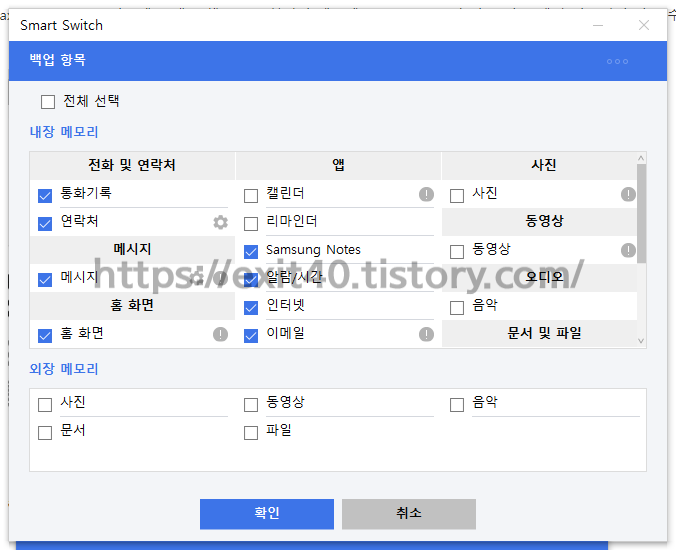 Smart Switch를 켠 뒤 '백업'을 클릭하시면 '백업 항목'이 나타나는데요, 처음에는 전체 선택이 되어있지만 빠른 백업을 위해서 상당수 체크 해제를 한 후 확인을 누르면 백업을 진행합니다.