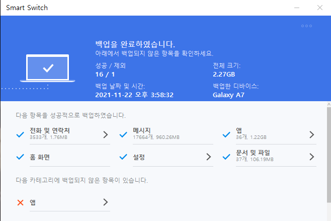 삼성 서비스 센터에서 조차 제 폰이 2017년도 모델이라 오래되어 백업이 안된다고 했고 그냥 초기화해야 한다며 아쉬운 소리를 해주셨지만 한번 더 방법을 찾아보고 된다는 것에 배팅을 하고 진행 한 덕에 일주일 정도를 번 셈이 되었습니다.