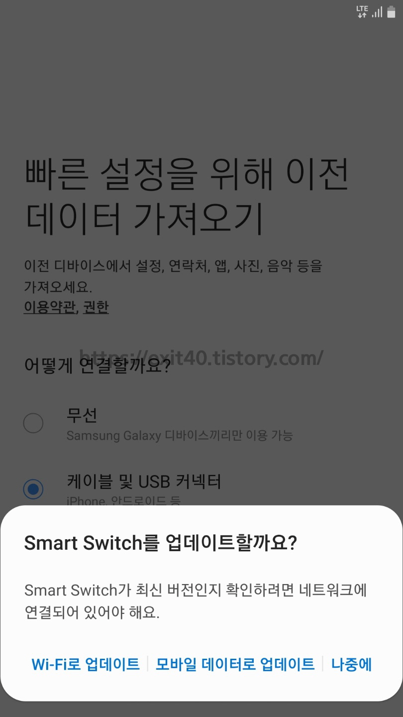 복원을 진행 하면서 스마트폰 초기 설정도 같이 진행했는데요, 첫 화면에 Smart Switch를 자동으로 다운을 받을 수 있게 돼있네요. '모바일 데이터로 엡데이트'를 클릭해줍니다.