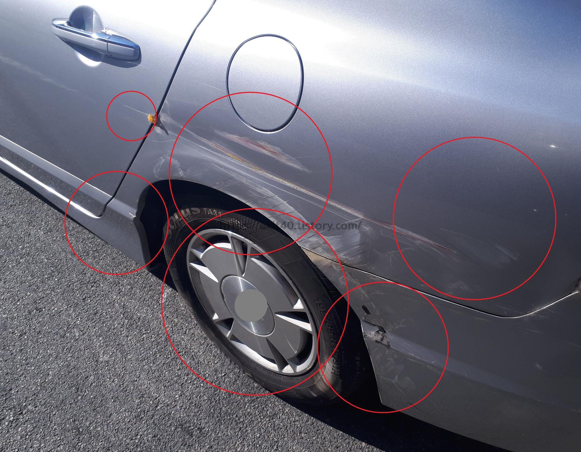 말끔히 수리된 부위를 보면서 그 간 서러움이 해소가 됐고 기분이 좋아질 뻔했으나 사진에 보이는 타이어만 갈고 반대쪽 타이어는 다른 브랜드라서 기분이 상했습니다.
