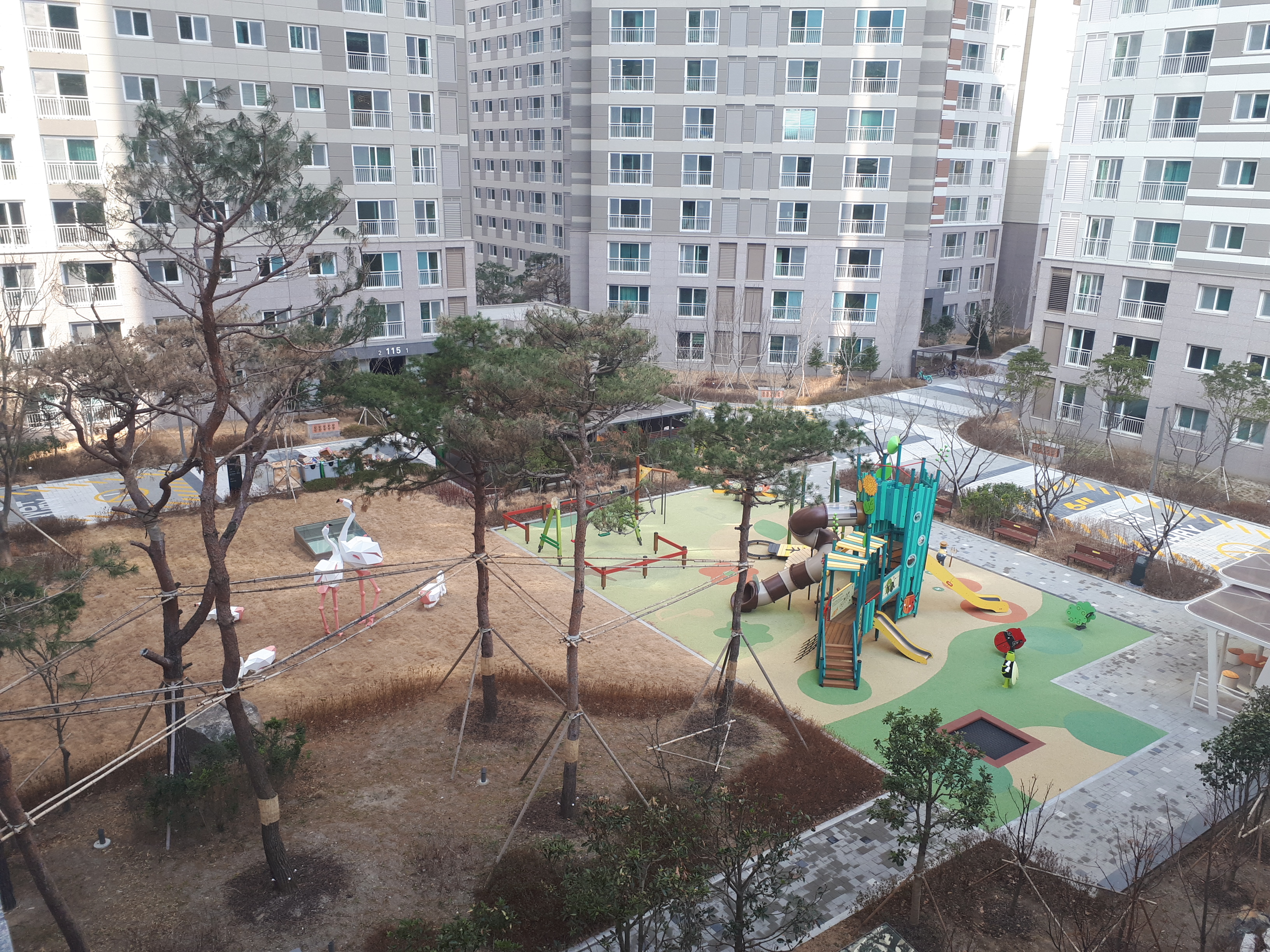120동 쪽에는 산책로와 홍학 조각상이 있었어요. 홍학 조각상은 높이가 2미터 이상돼 보였어요. 이 아파트는 뭐든지 다 커서 다 올려다봤습니다.