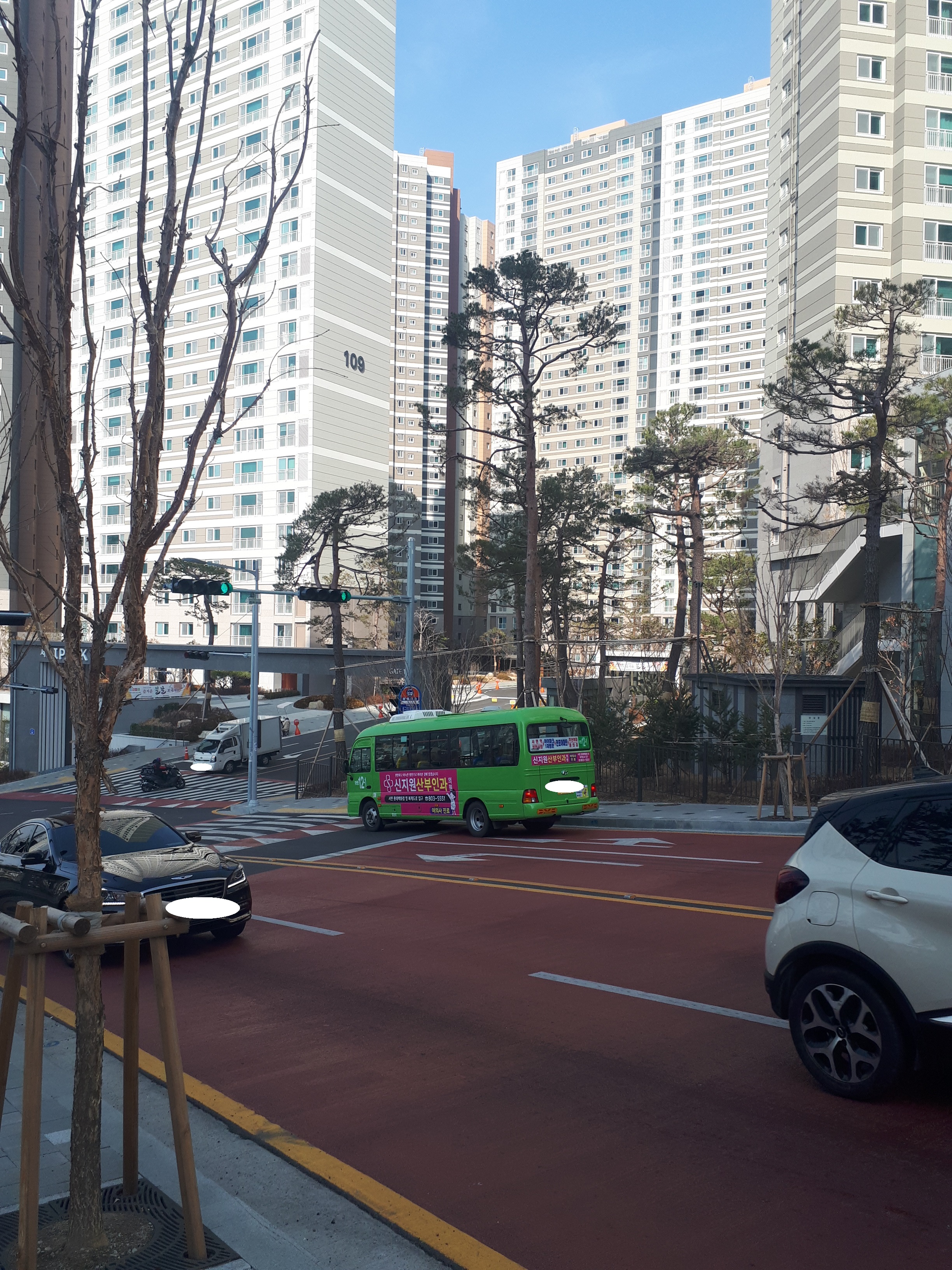 정문 앞에는 마을 버스정류장이 있습니다. 주민들의 힘으로 정문에 시내버스가 다닐 수 있게 만들 수 있을 것 같습니다.(현재 시내버스는 101동 건너편과 122동 위쪽 라인 82번만 다님)