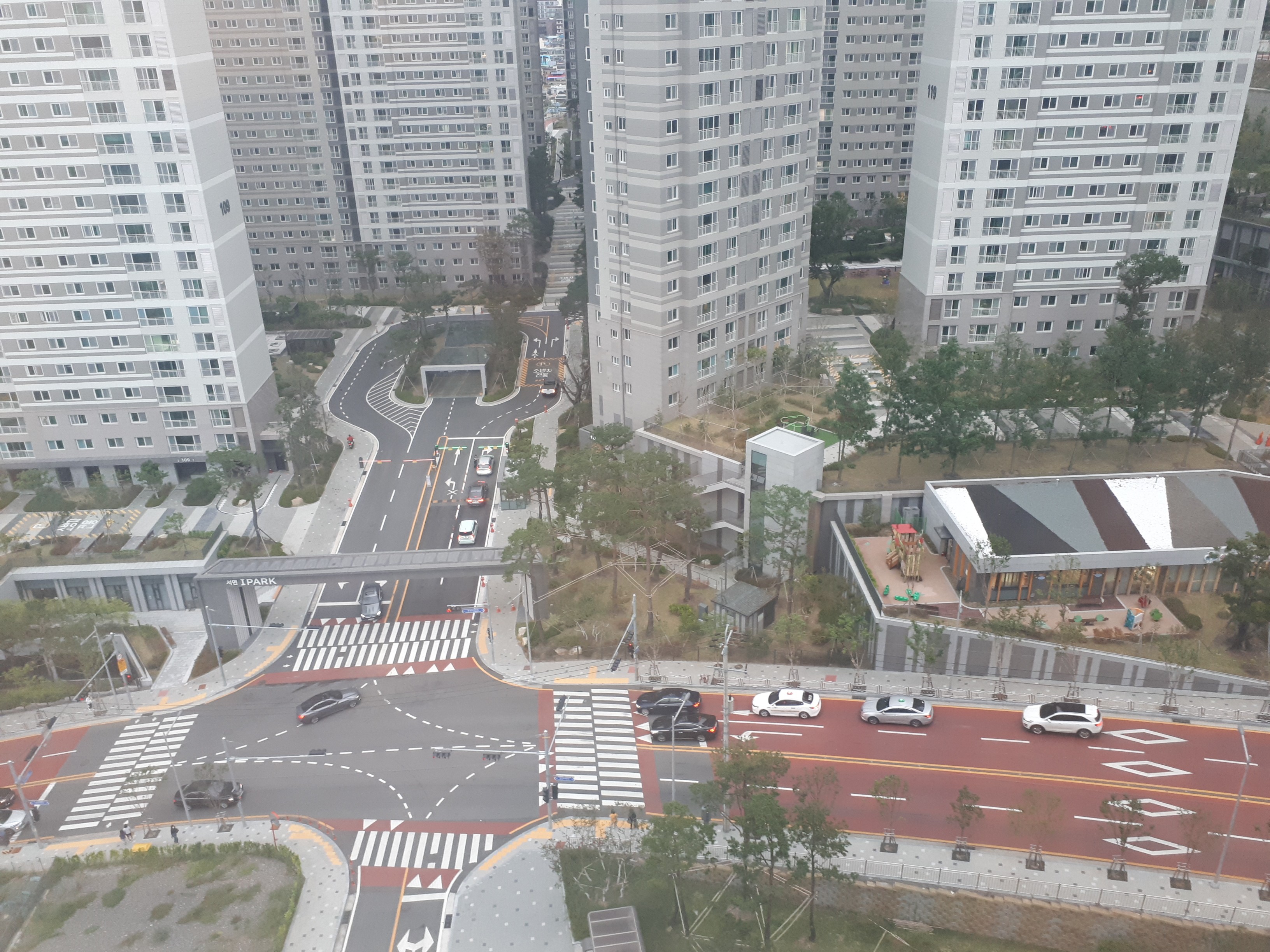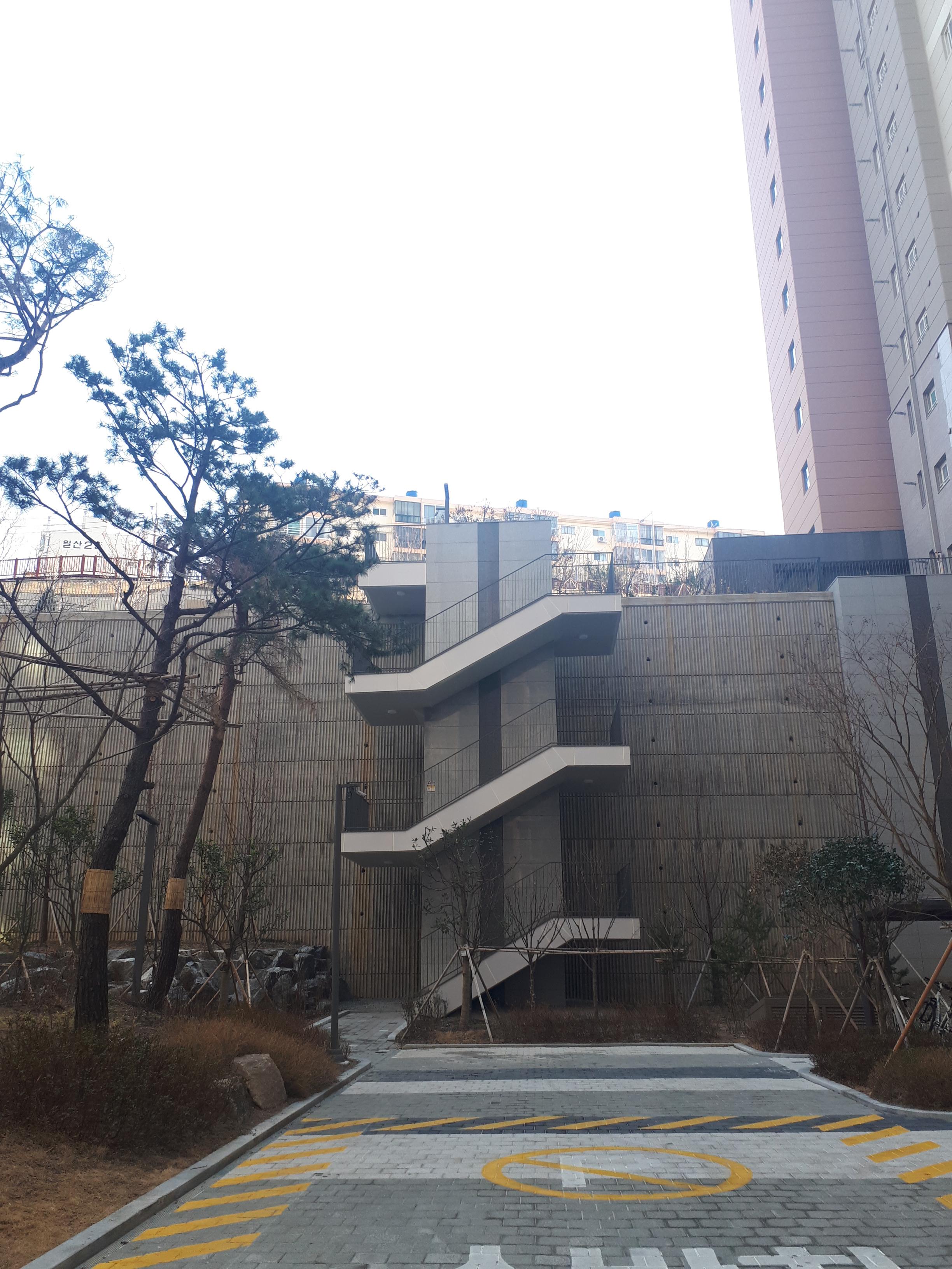 주차장 바로 앞에는 위로 가는 통로가 있었습니다. 1단지가 보이고 그 앞에 조경과 휴식공간에 신경을 많이 쓴 것을 볼 수 있었어요.