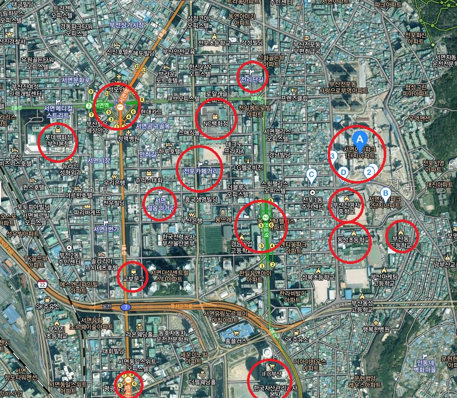 지도로 보면 바로 앞에 여자중학교가 있고 뒤쪽에는 도보로 30분 걸리는 황령산 전망대가 있습니다. 부산의 중심상권인 서면을 도보로 이용 가능하고 1,2호선 더블역세권 약간 고바위지만 곳곳에 있는 엘리베이터로 힘들게 올라갈 필요가 없어 단점을 보완하였습니다.
