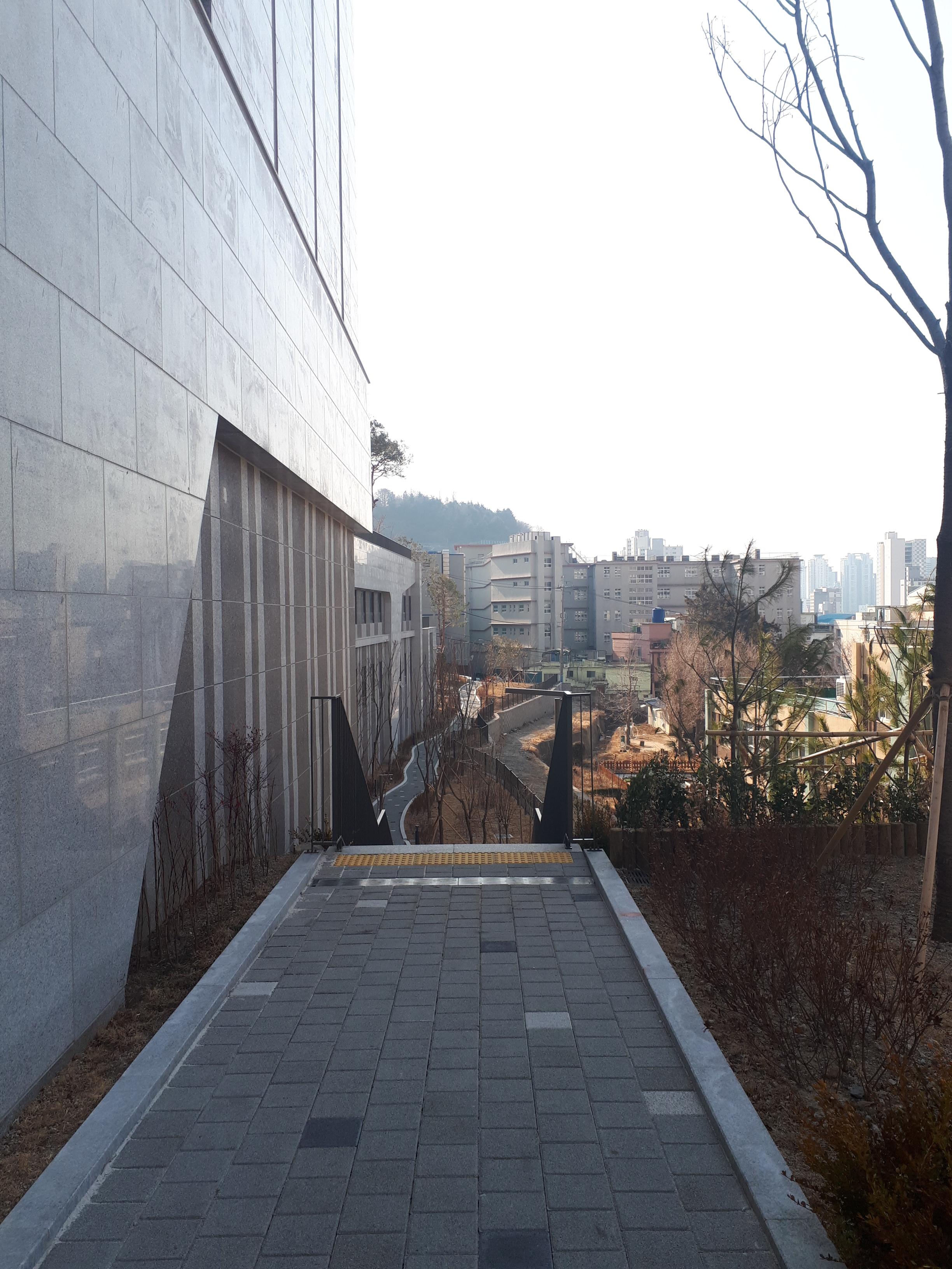 계단을 올라가다가 옆을 보니 시멘트 벽이 옆에 뻗어있는 것이 보였습니다.