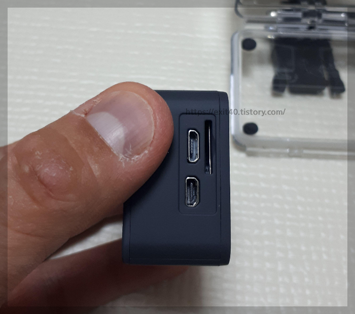 크기는 계란 한 개 정도로 작아 휴대성이 좋고 액션캠 오른쪽 측면에 SD카드 슬롯, 5핀 USB 잭, 마이크로 HDMI잭이 있어 다른 기기를 통해 파일을 옮기기 쉬웠습니다. 근데 USB 타입을 어떤 유튜버는 C타입이라고 소개했던데 5 핀이네요..