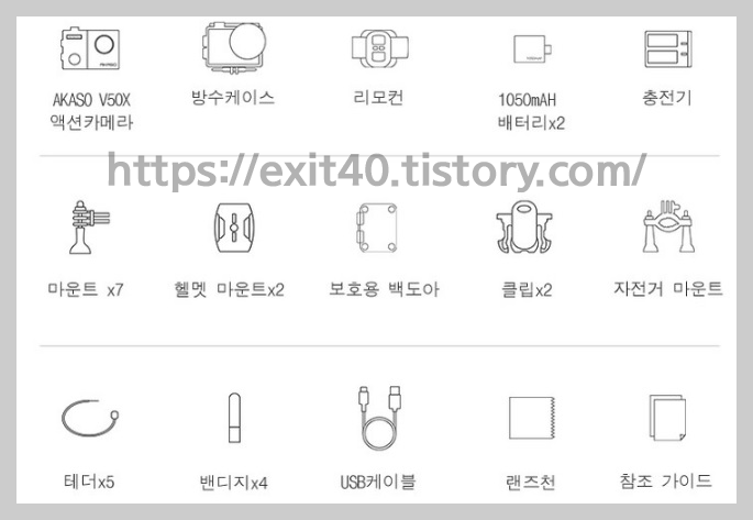 차량 마운트, 자전거 마운트, USB, 리모컨, 방수 케이스, 배터리, 배터리 충전기 등 고프로 못지않은 구성품을 보여 주었습니다.