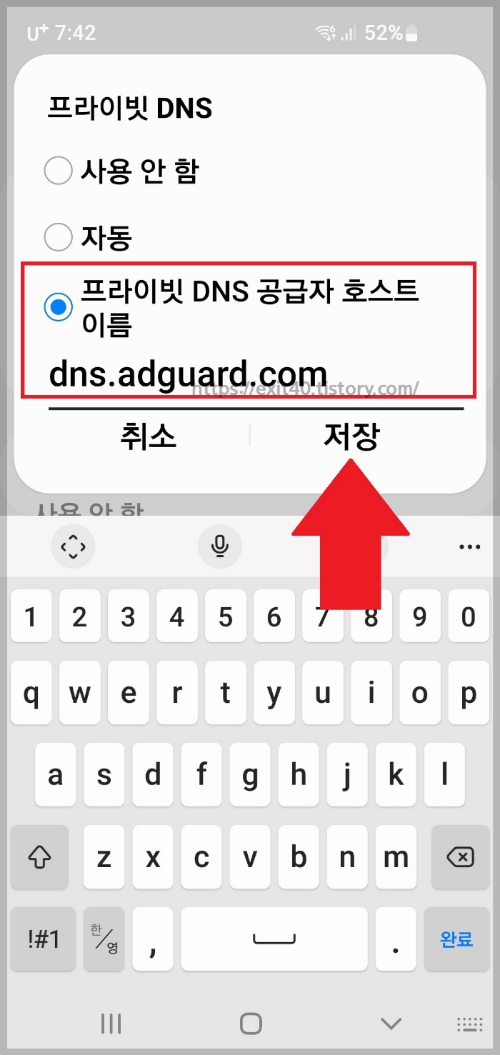 기본 설정은 '사용 안 함'으로 되어있고 '프라이빗 DNS 공급자 호스트 이름'을 클릭해서 아래와 같이