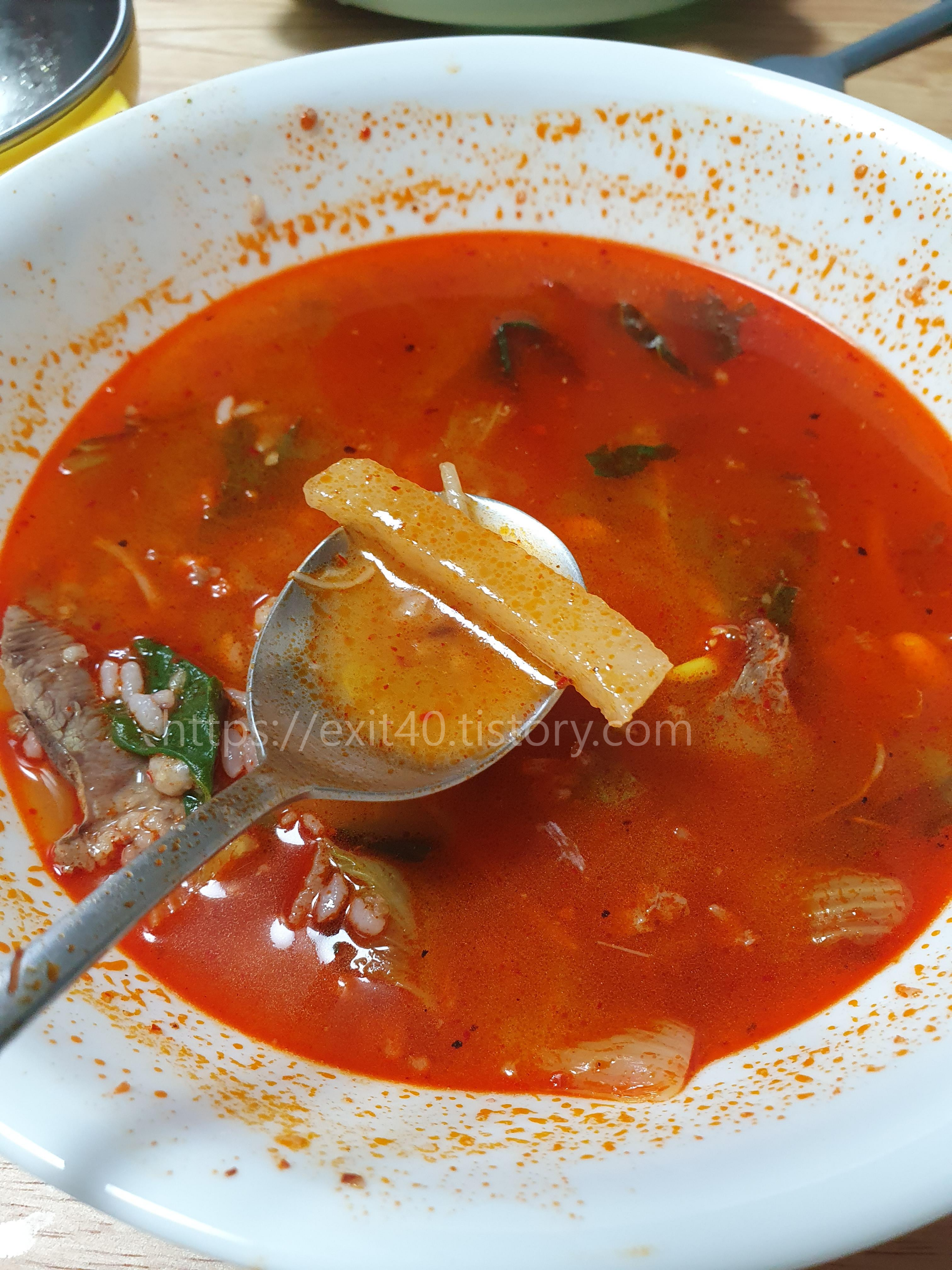 이 해장국의 특이한 점은 위 사진에 보이는 '무'인데요, 부드럽지도, 딱딱하지도 않아 적당히 씹는 느낌도 나면서 식감을 좋게 만들어주는 역할을 했습니다. (5~6개 정도 들어있는데 말렸다고 보면 될 듯?)