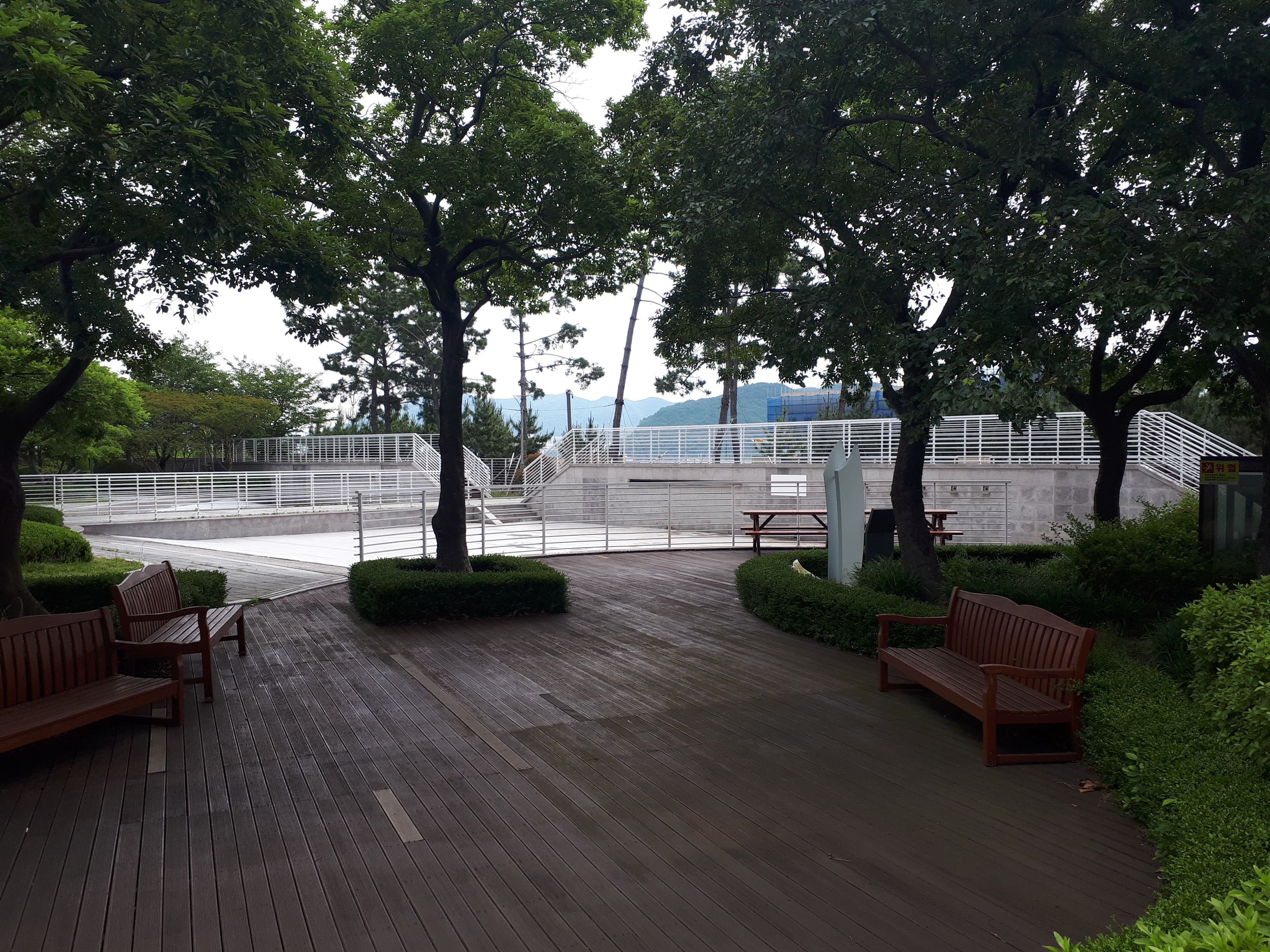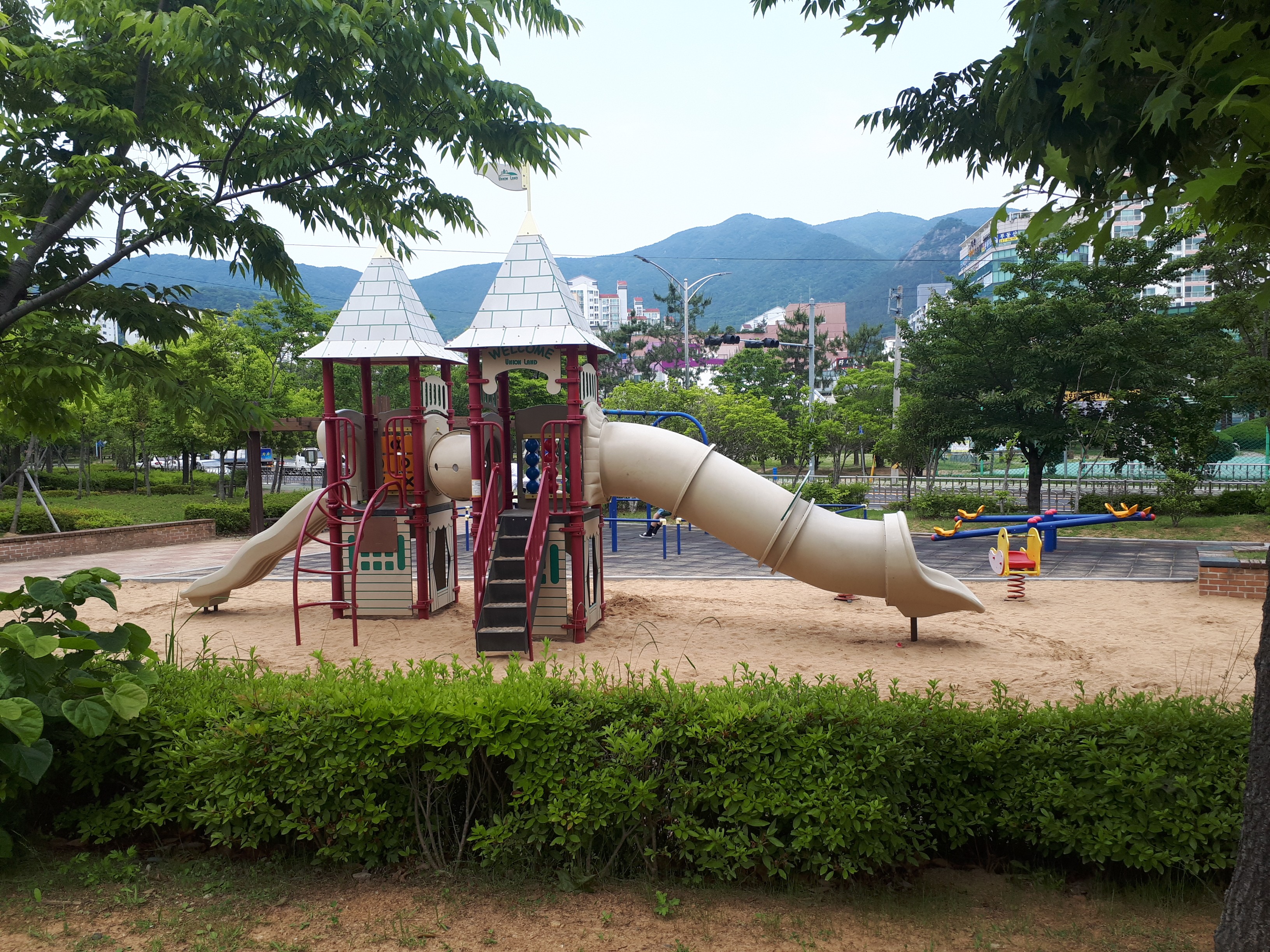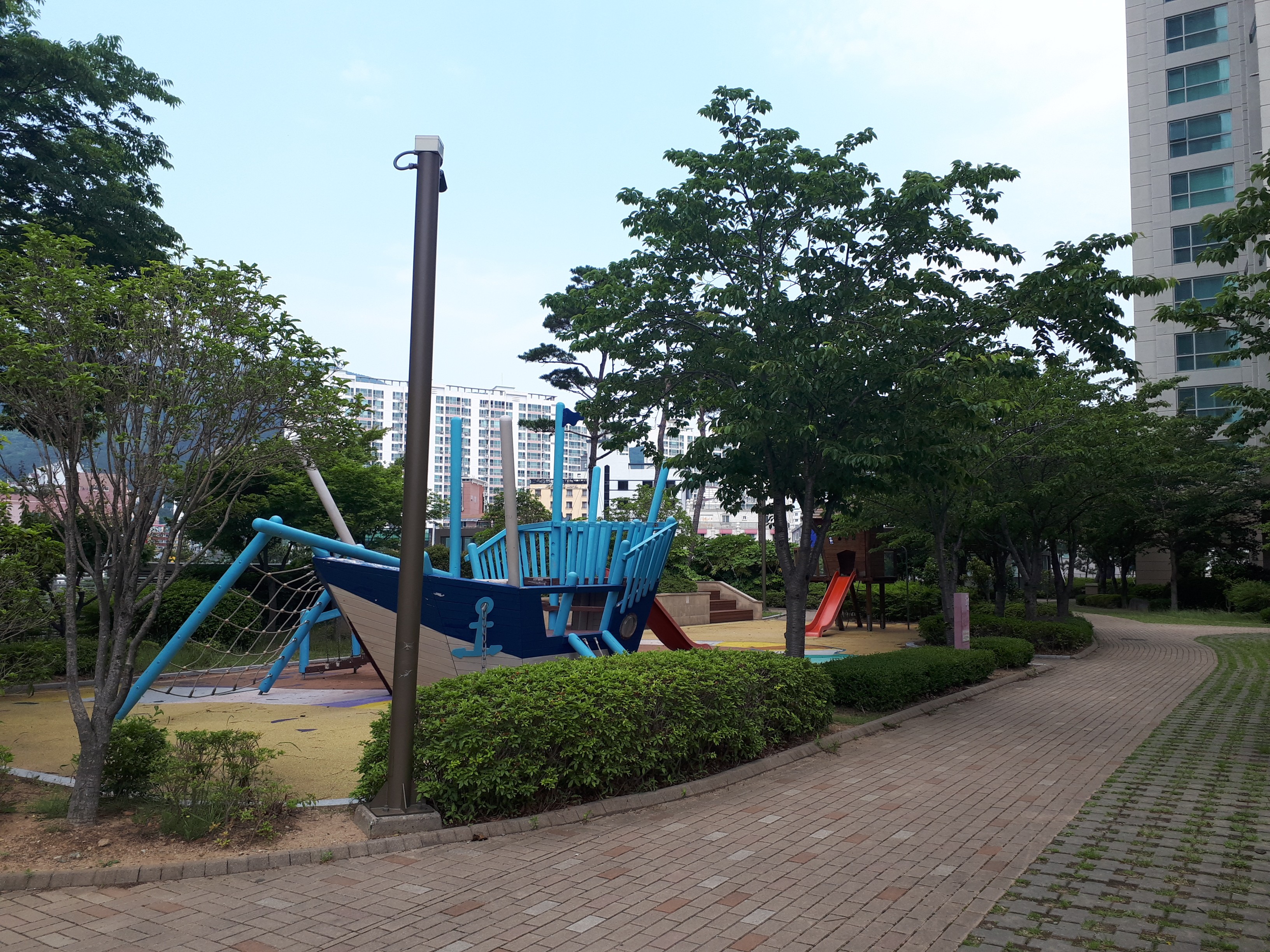 트로피칼 카페 바로 옆에 어린이집이 있었고 그 앞에는 크루즈의 갑판을 연상시키는 넓은 공원이 있었습니다.