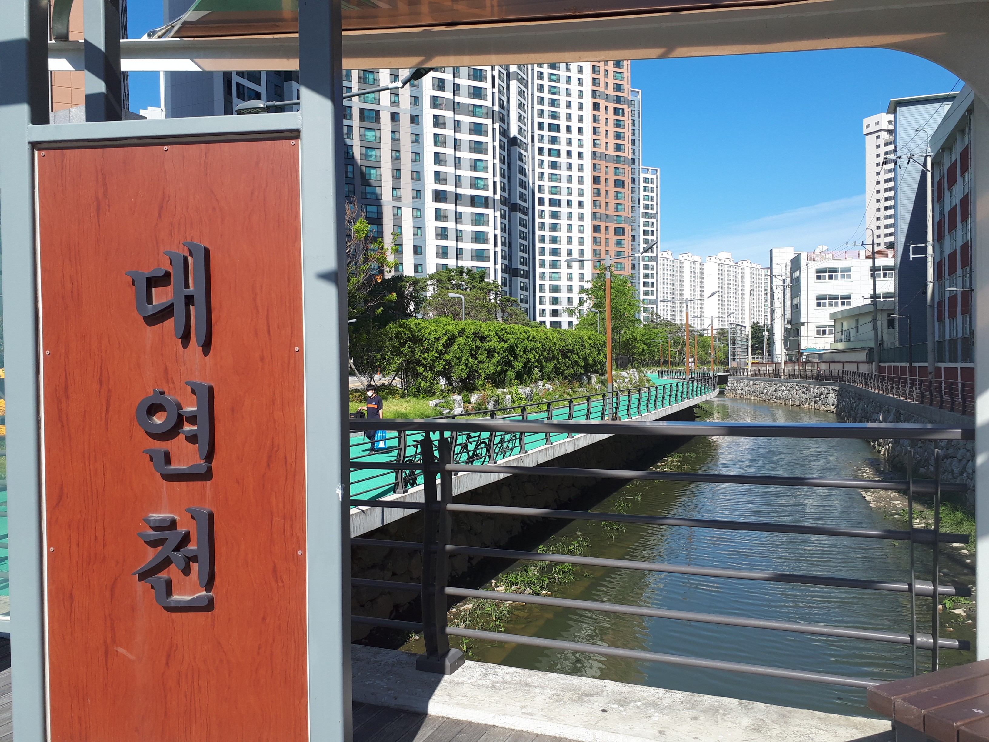 길게 쭉 뻗은 대연천을 따라서 많은 사람들이 이동 중이었는데요 아침에 조깅하는 사람들도 많아서 활기가 넘칠 것 같습니다.