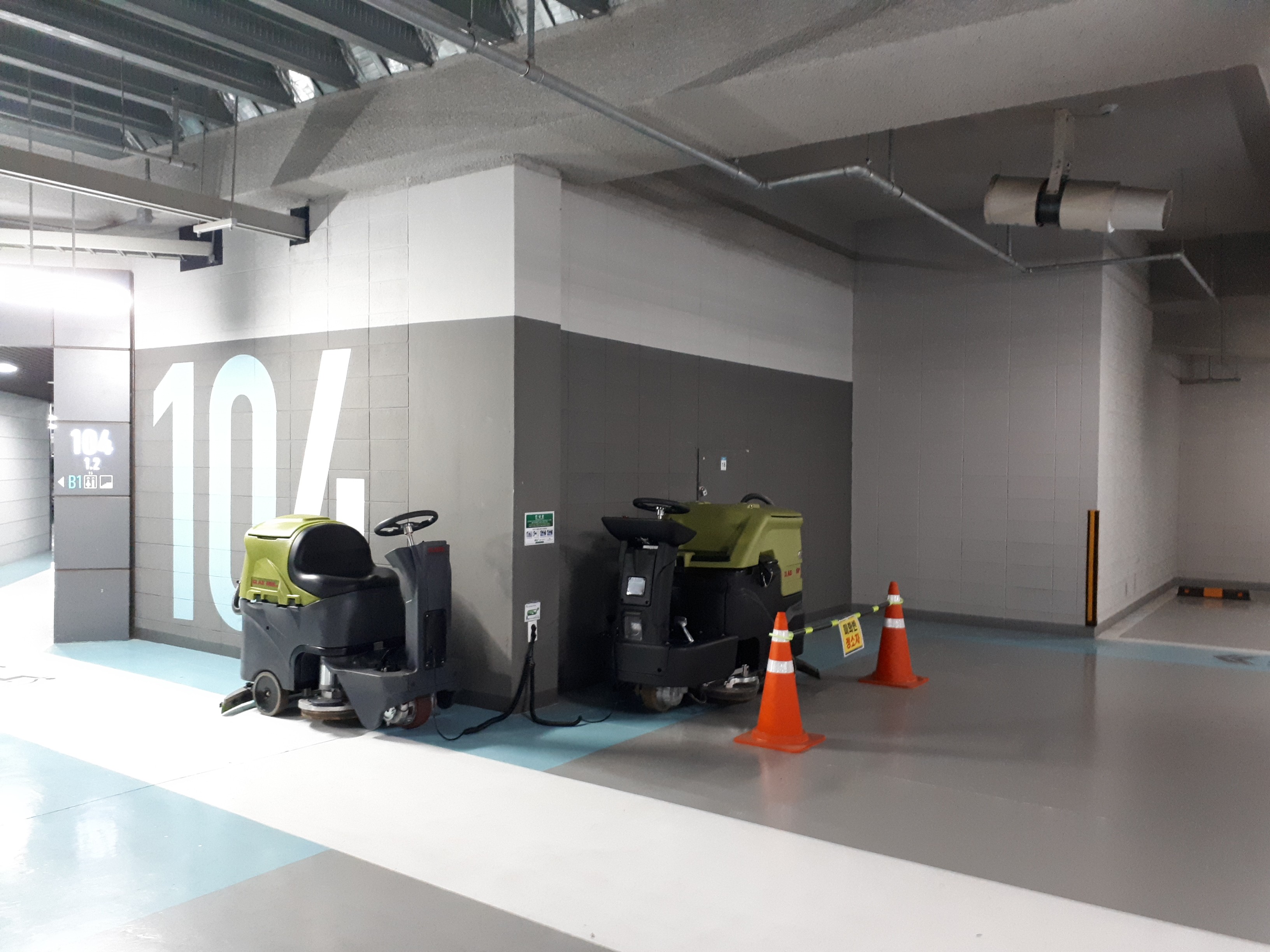 지하주차장은 잘 닦여있었고 차간 거리도 넓어 주차 스트레스는 없었습니다. 지나가다 보니 청소 기계가 있어 청소 등 관리가 잘 이루어지고 있었습니다.