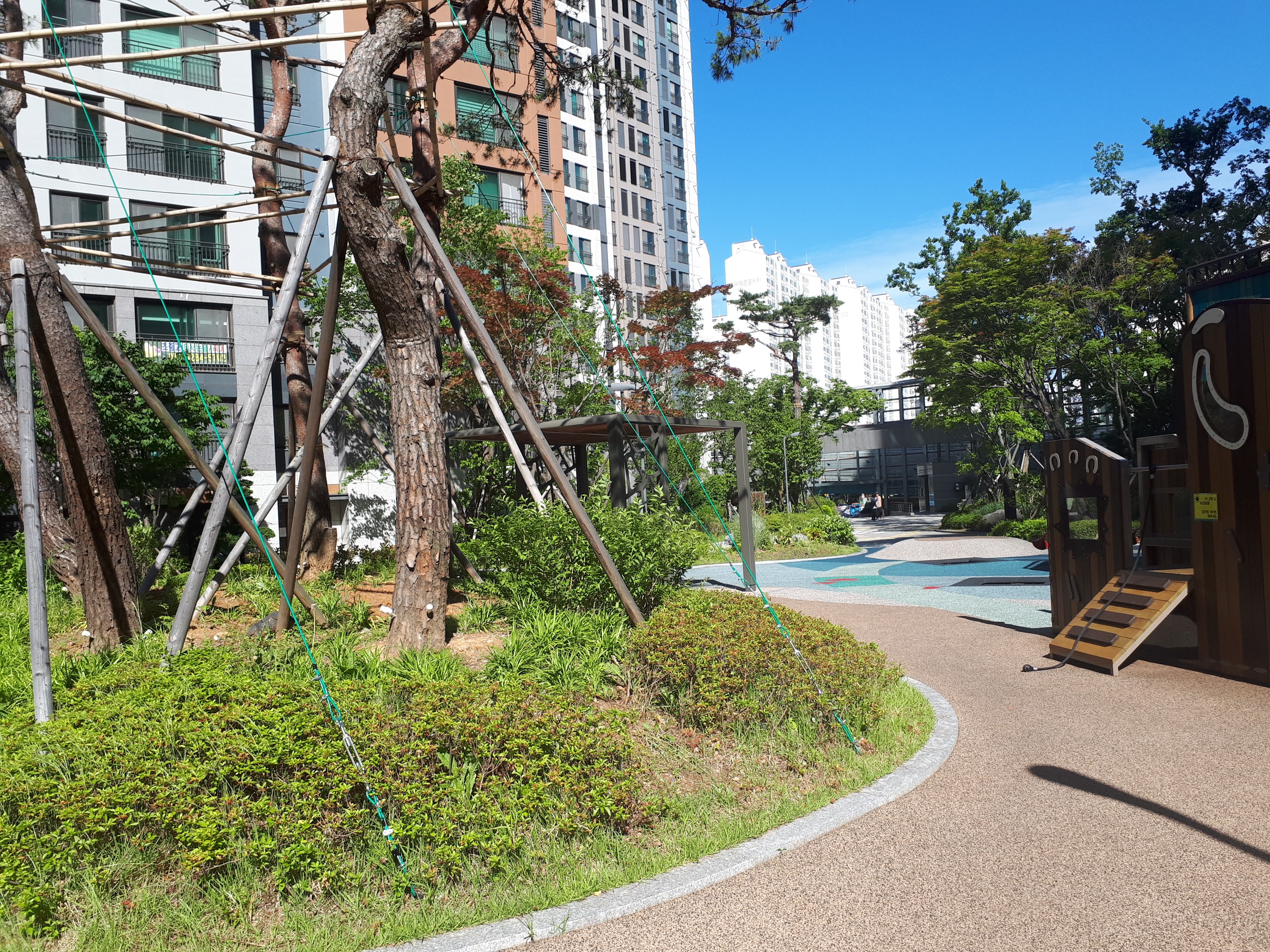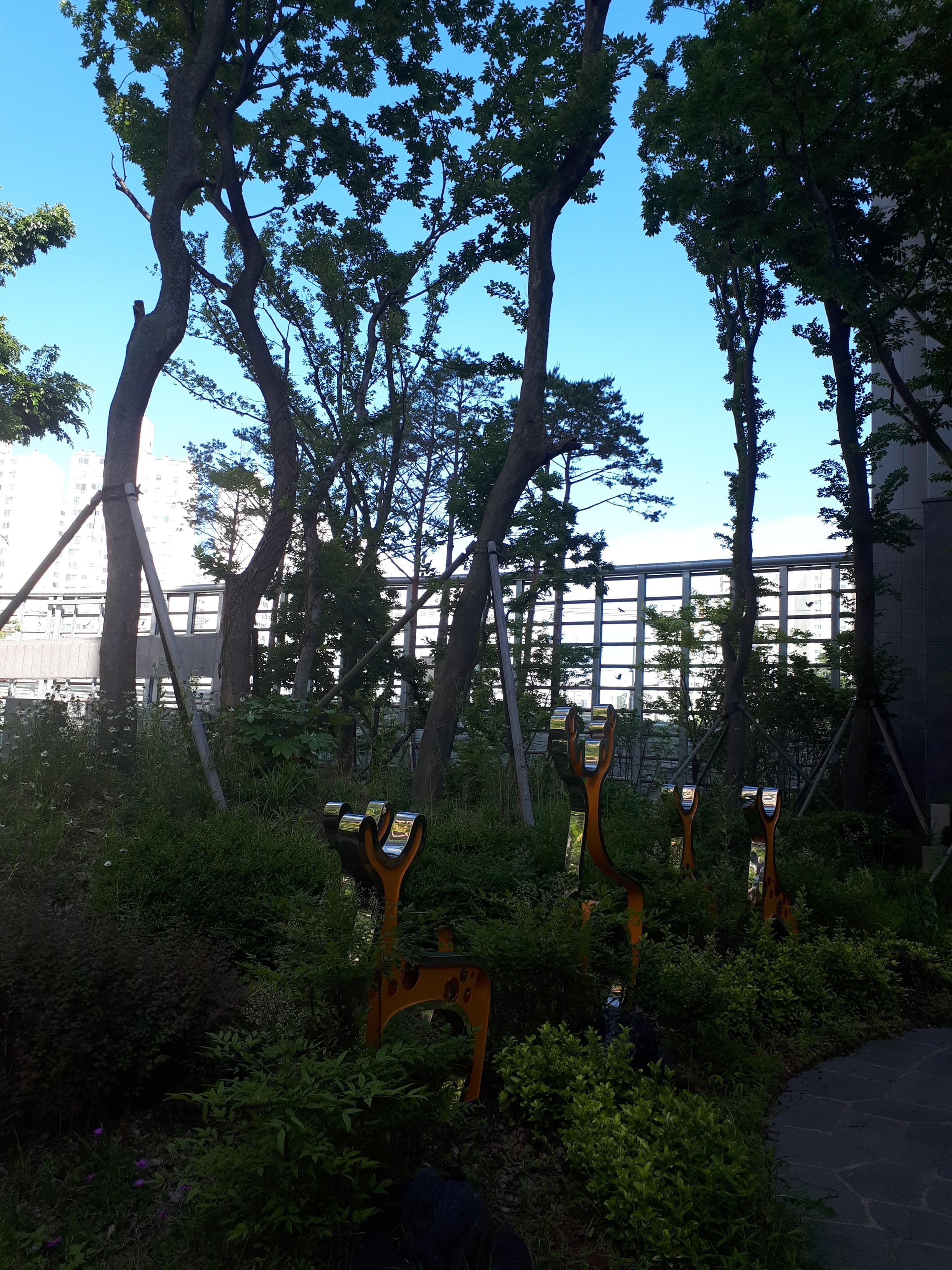 조형물들도 식물들과 어울리는 것들로 '도심 속의 숲 속'을 표현하기에 안성맞춤이었습니다. 길을 따라 설치된 방음벽은 준공되기 전 걱정하던 소음문제를 말끔히 해결하여 한창 바쁜 시간대인 오후 4시에 지나가도 시끄럽다는 생각은 들지 않았습니다. 그만큼 건설사에서 특히나 신경 쓴 부분임을 알 수 있었습니다.