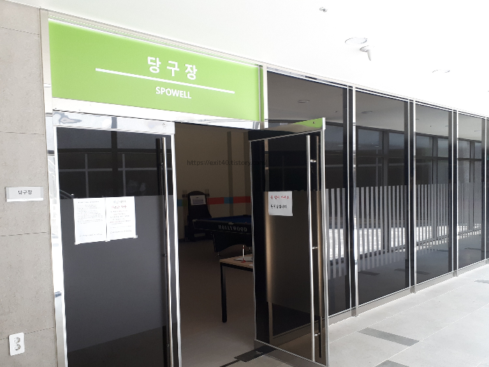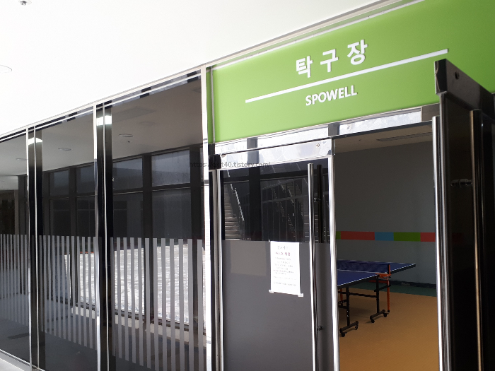 사람이 한두 명씩 있어 탁구장 밖에 찍지 못했는데요, 공간이 상당히 넓은 것을 보실 수 있습니다.