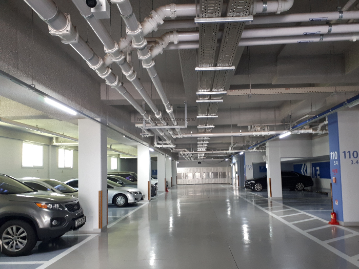 동별로 지하 1층으로 가는 입구는 하나이며 주차공간은 넓었고 호수별로 개인 캐비닛이 있어 편의성이 좋아 보였습니다.